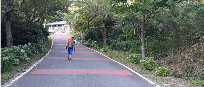 | ▲고성사에 오르는 막바지 길이 아스팔트 경사길이다. 점심을 거른 허기진 배로 몇 시간을 걸어 기진맥진 고성사에 도착했다. This photo shows, steep hill leading up to the Goseong Temple. |