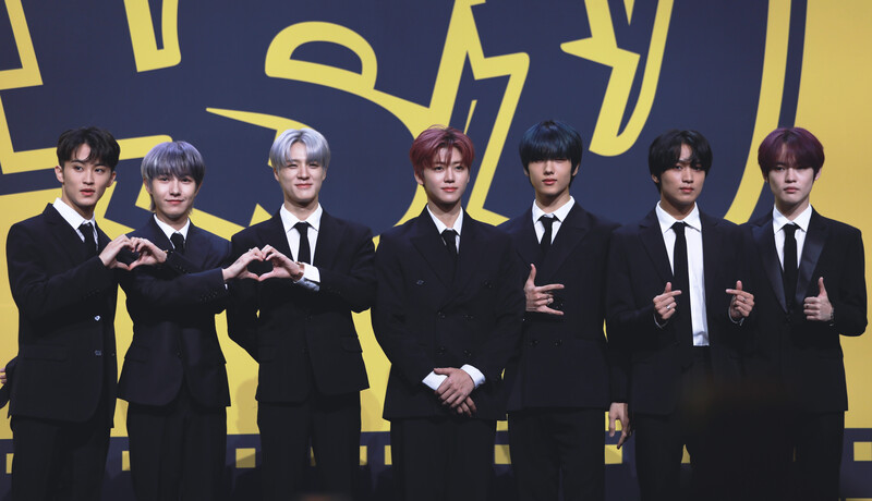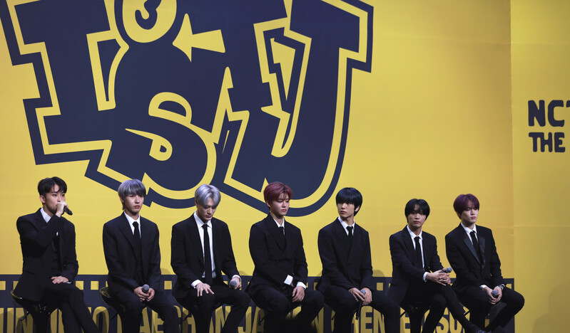 These photos taken during the press conference of K-pop boy group NCT DREAM during press conference of their album 'ISTJ' show members posing for group photos.