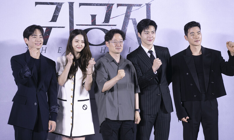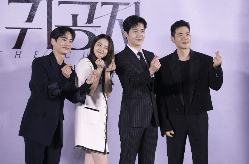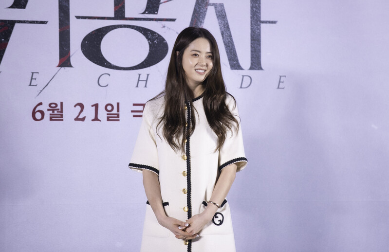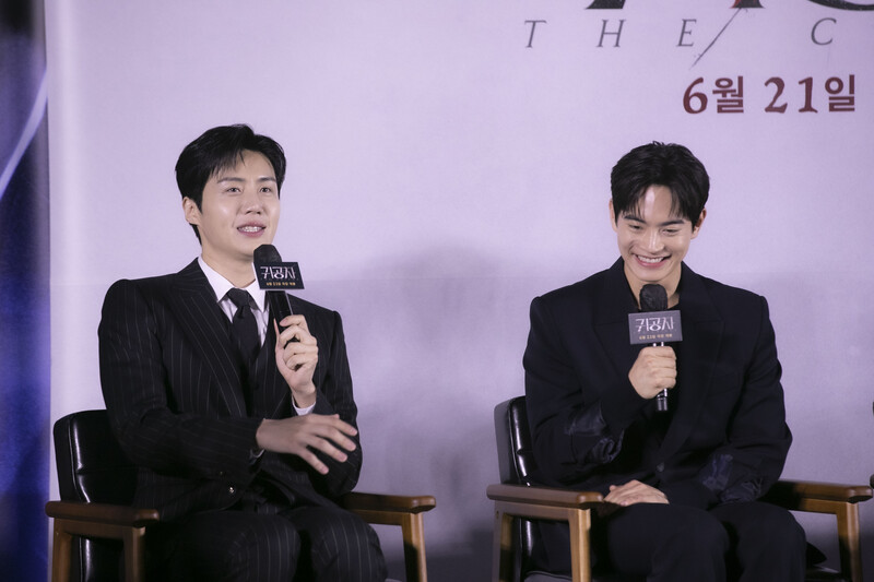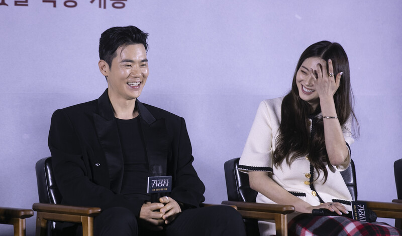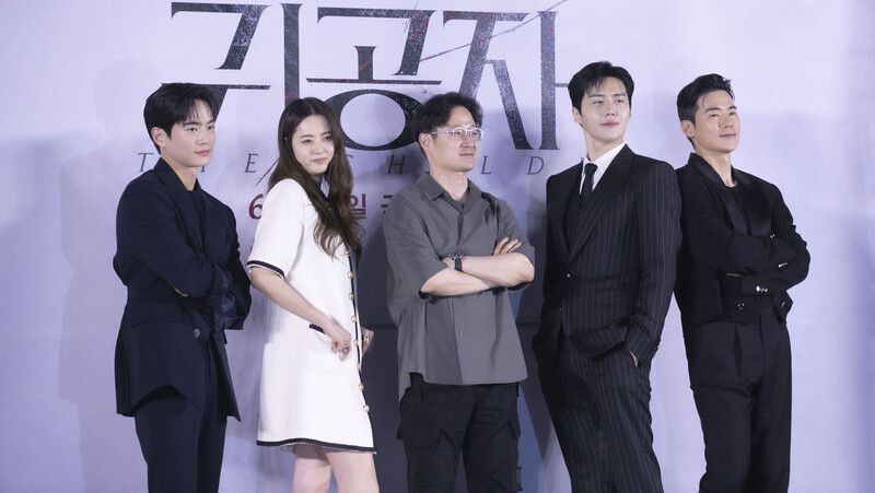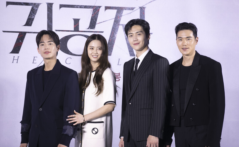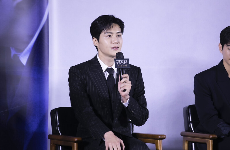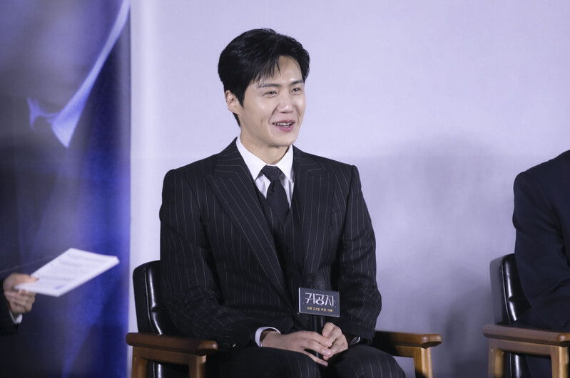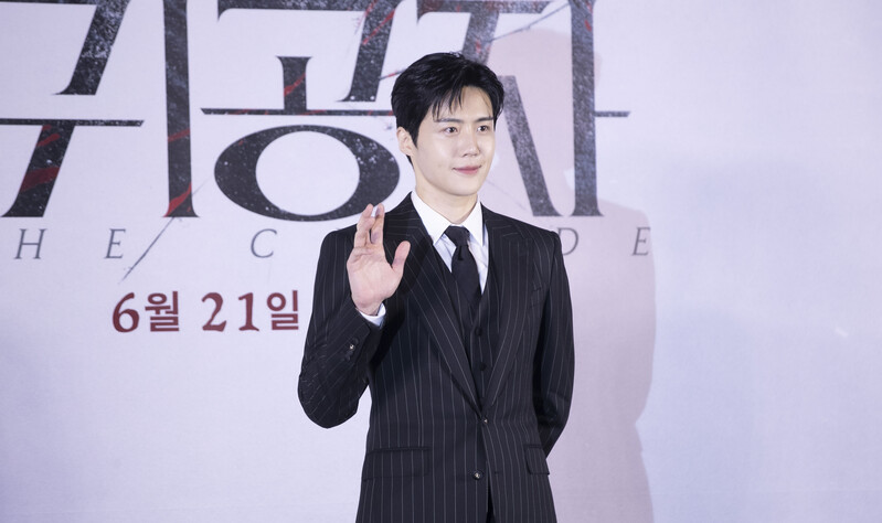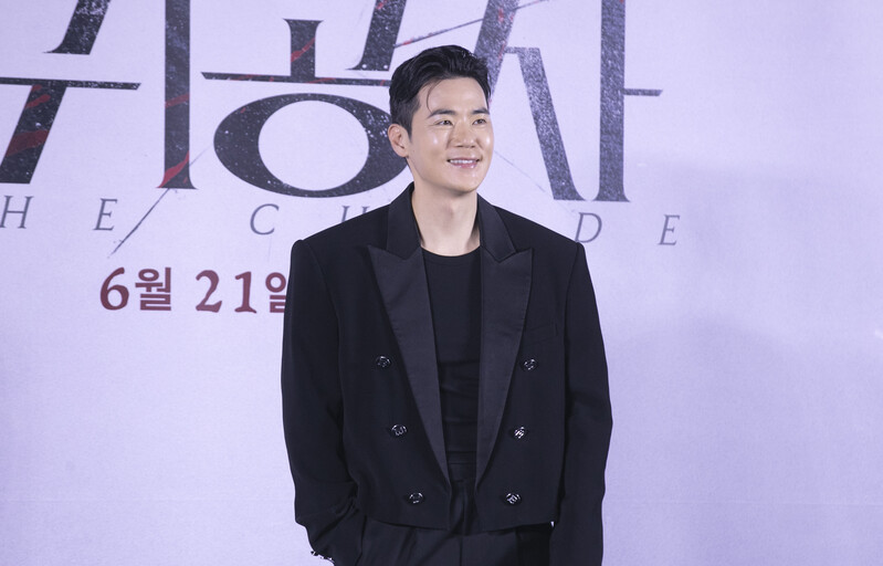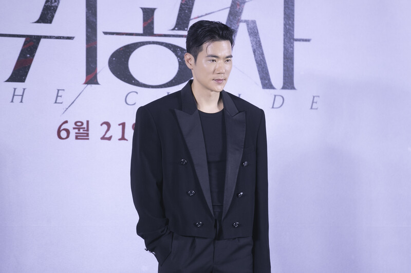 These photos, taken during the press conference of the upcoming movie "The Childe" show actor Kim Seon-ho and various other cast members during the event.