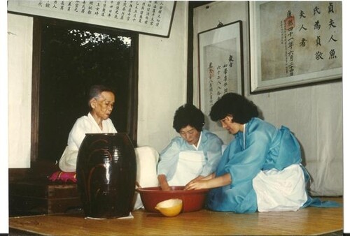 Songjeolju was passed down through the family of Chungyeonggong Lee Jeong-ran during the reign of King Seonjo of Joseon. In the late 19th century, Heo Seong-san (1892-1967), the wife of Lee Pil-seung, brewed Songjeolju at her in-laws' home. Her daughter-in-law, Park A-ji, continued the tradition. In 1989, Songjeolju was designated as Seoul’s Intangible Cultural Heritage No. 2, with Park A-ji recognized as the custodian of the brewing technique. After her passing in 1991, her daughter-in-law, Lee Seong-ja, was appointed as the new custodian. Currently, the tradition is carried on by Lee Seong-ja’s daughter-in-law, Park Min-jung.