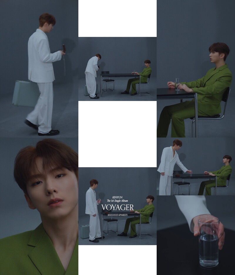 These photos, provided by Starship Entertainment, show the mood samplers for MONSTA X Kihyun's upcoming single "VOYAGER," which will drop on March 15.