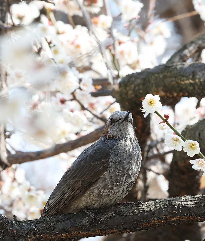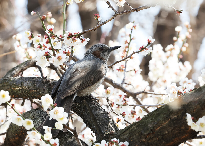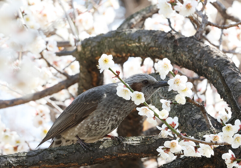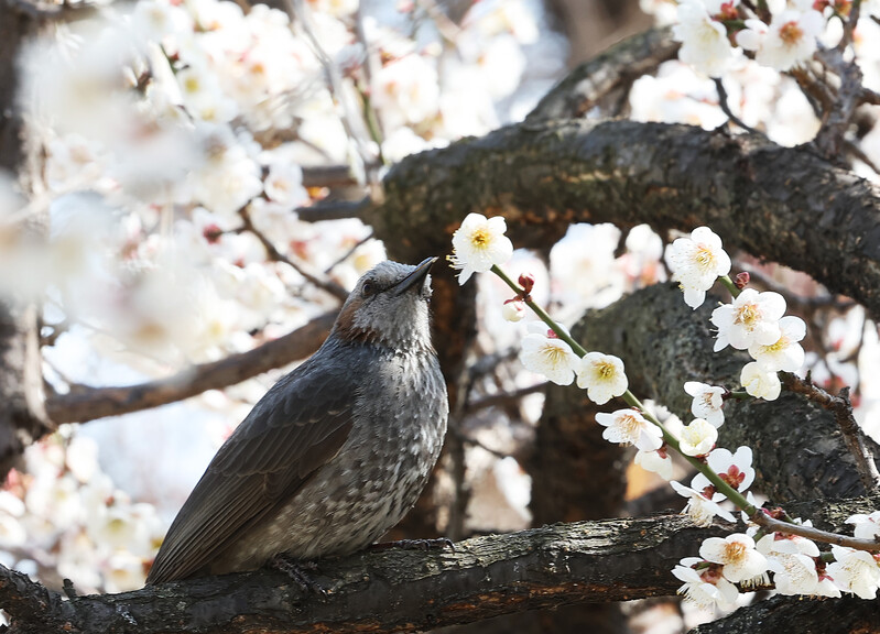 On the 29th, a brown-eared bulbul sits on a plum tree in full bloom on Hwaseong Fortress Road, a World Heritage Site in Suwon, Gyeonggi-do.