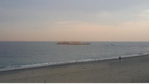 200 meters away from the shore, a large pile of rocks can be seen in the sea.