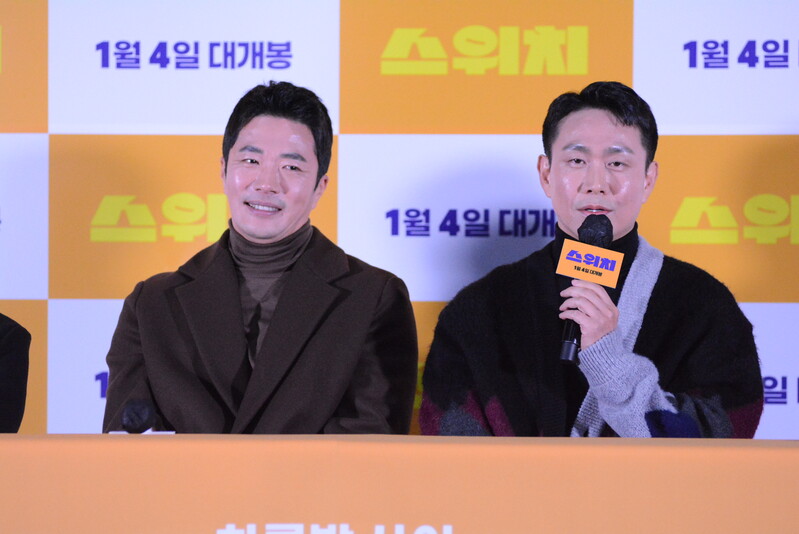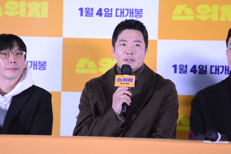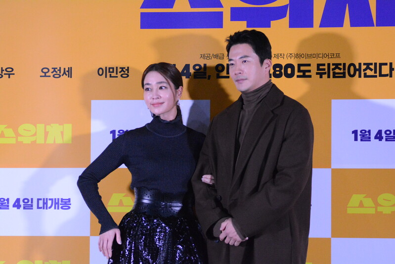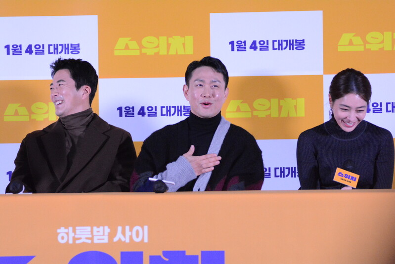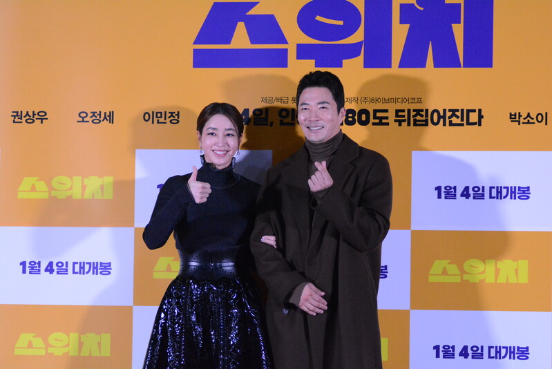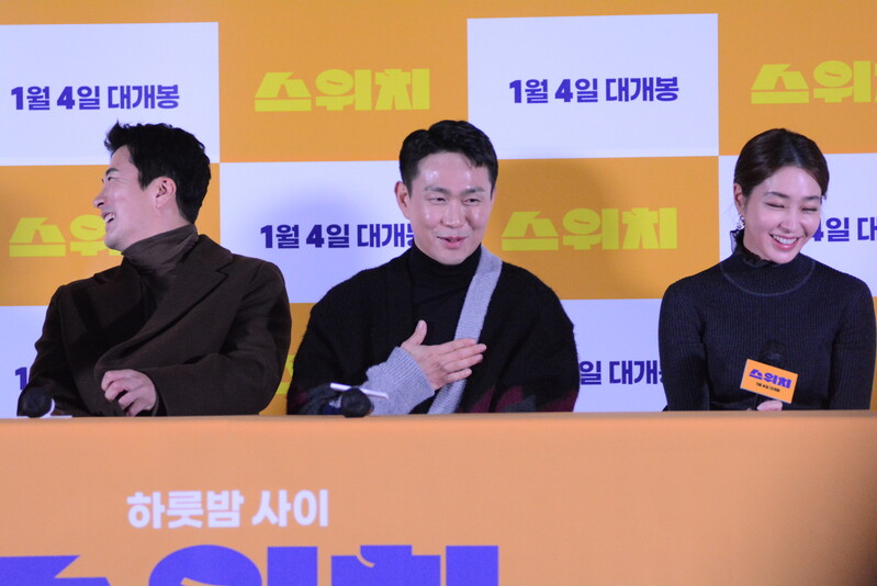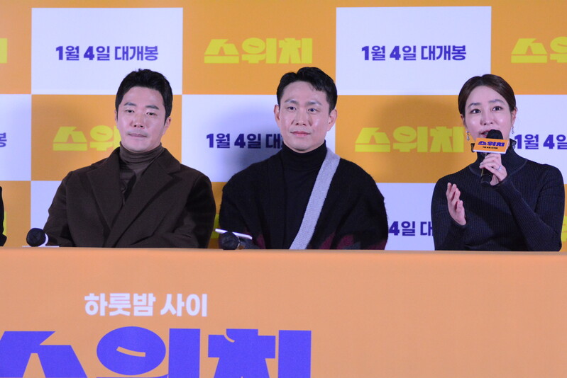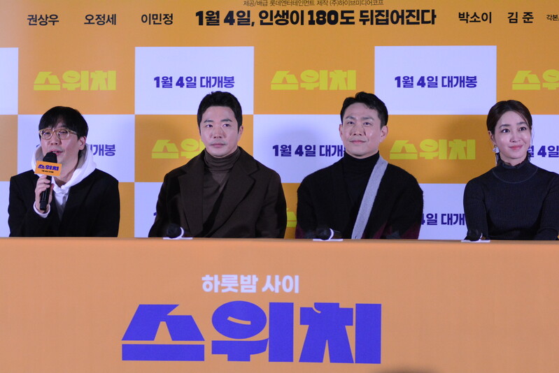 These photos taken during the press conference of the upcoming South Korean movie "Switch" show actor Kwon Sang-woo, Oh Jung-se and actress Lee Min-jung posing for individual and group photos and answering questions related to the movie.