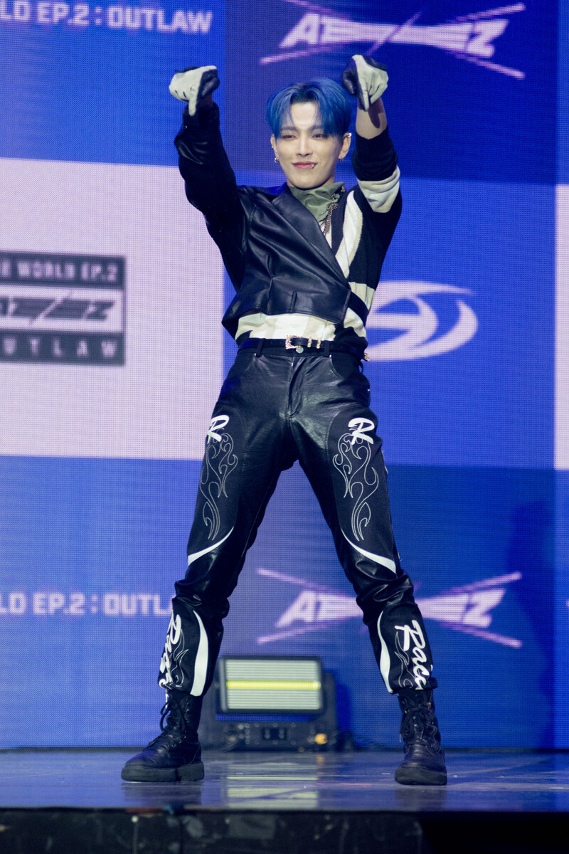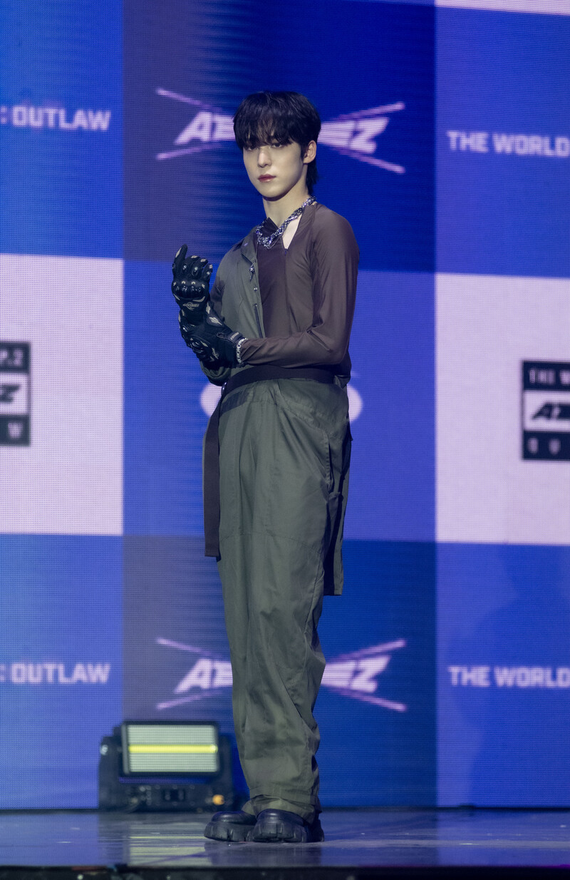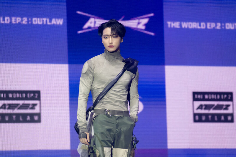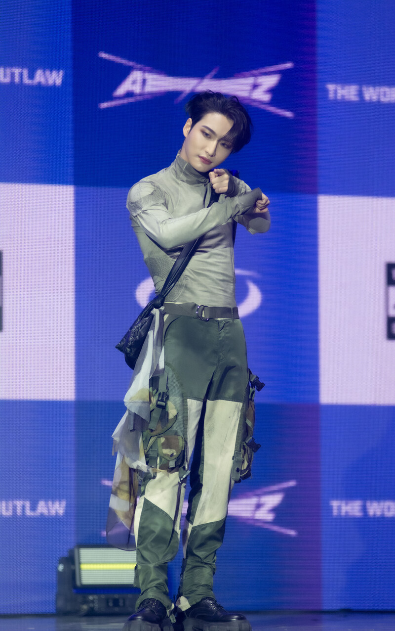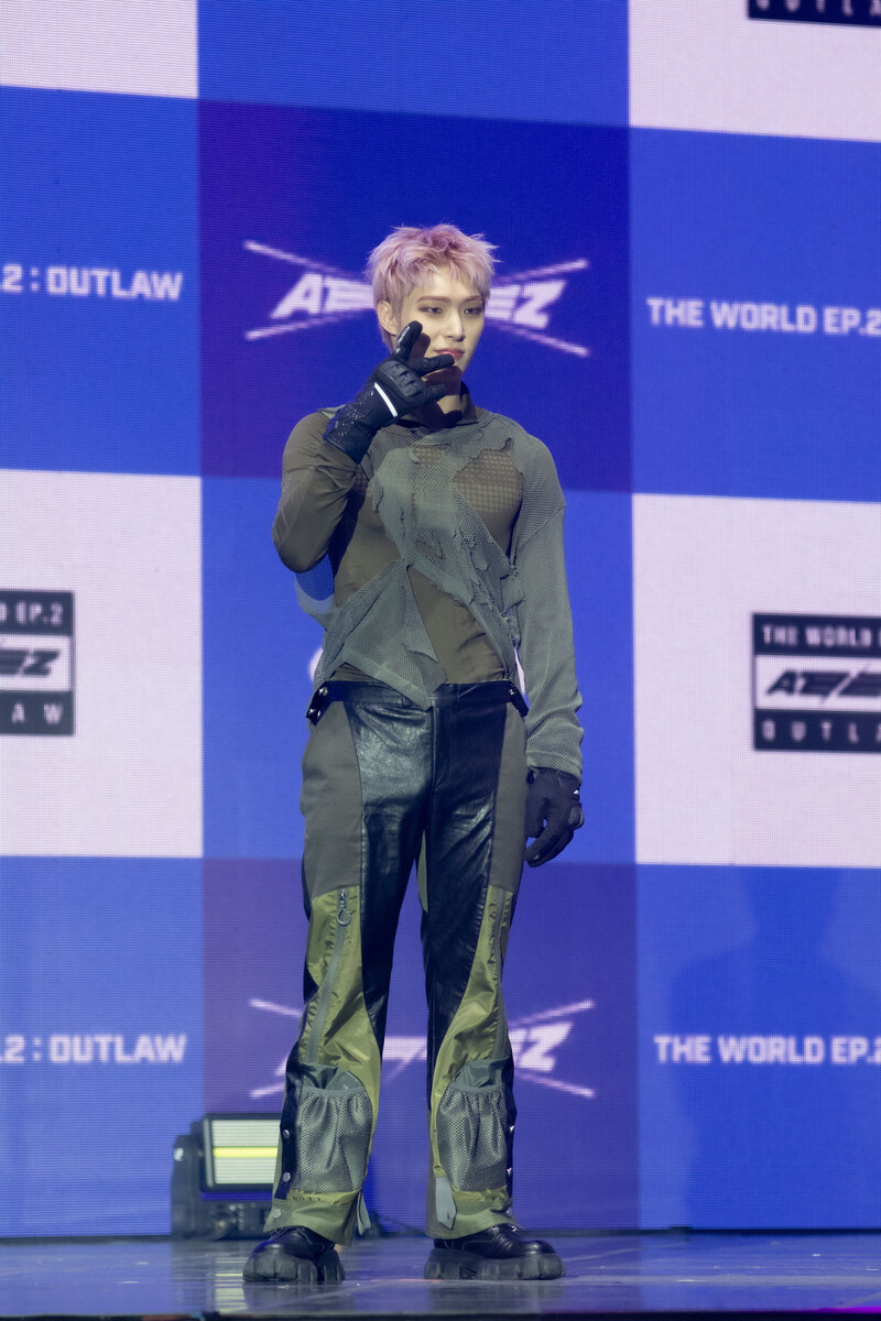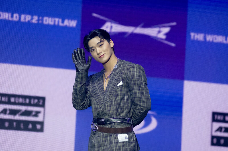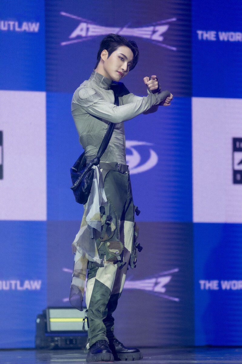 These photos taken during the media showcase of K-pop boy group ATEEZ's 9th mini album "The World Ep:2 : Outlaw" show members posing for their individual photos .