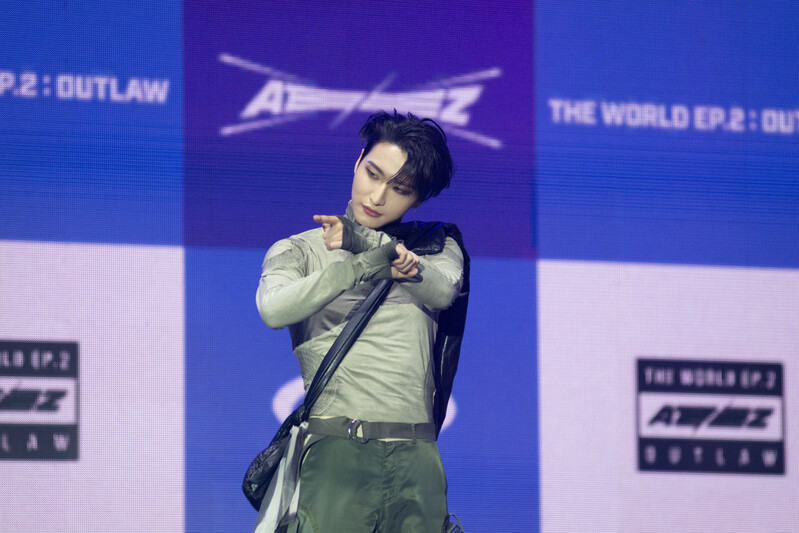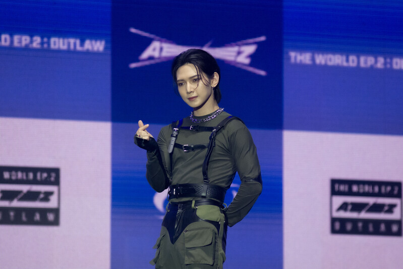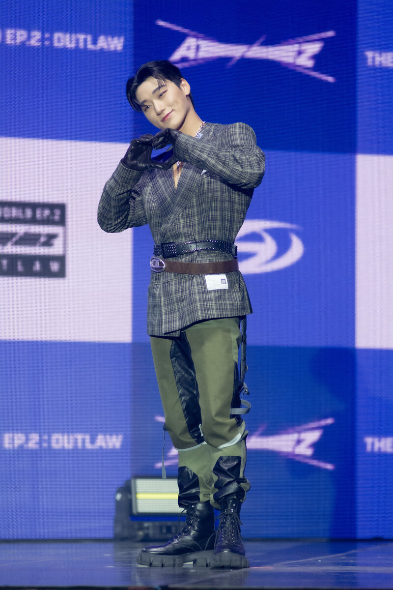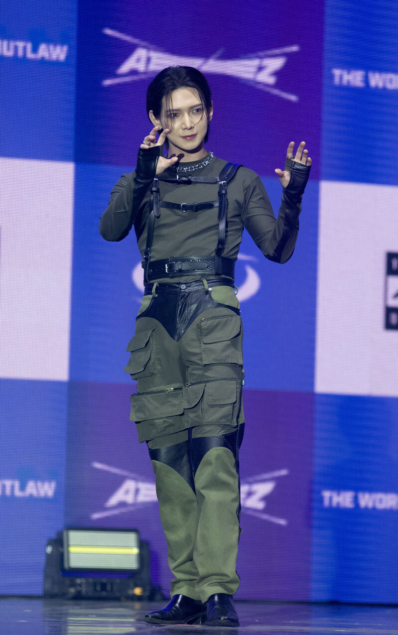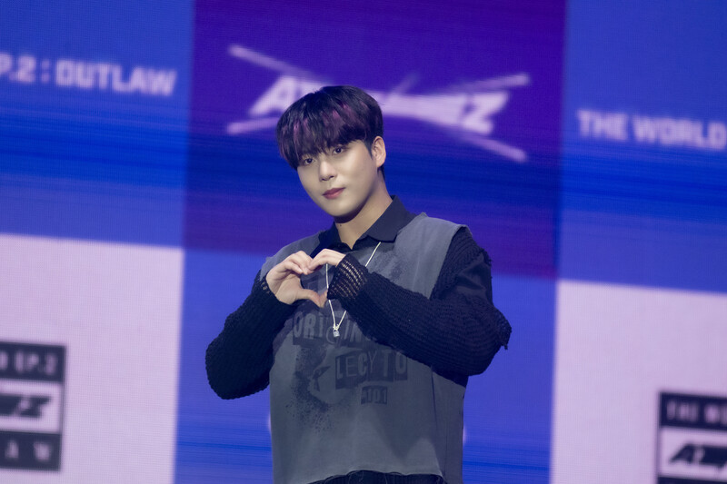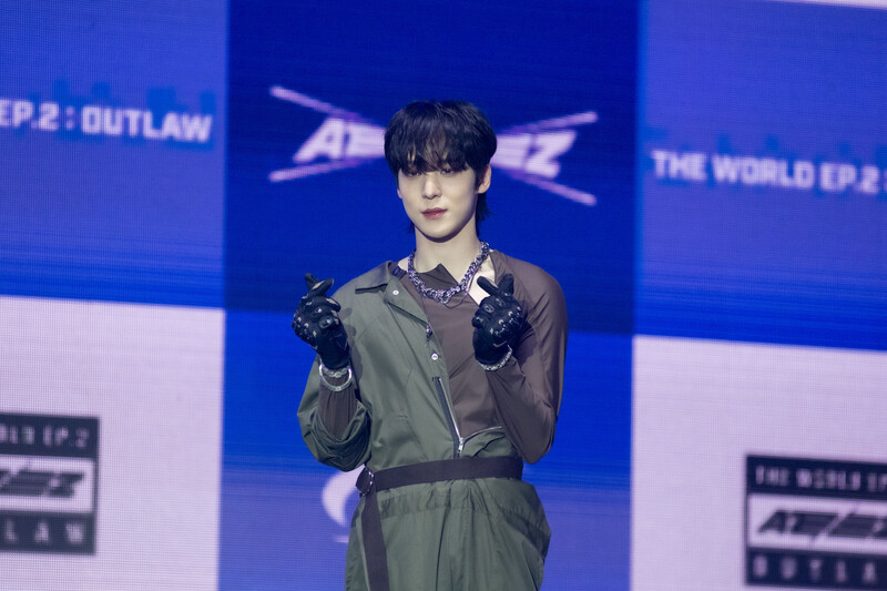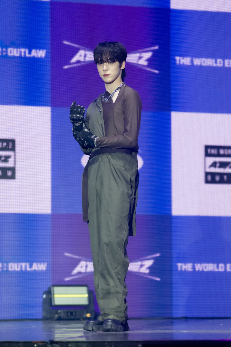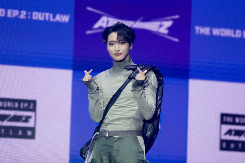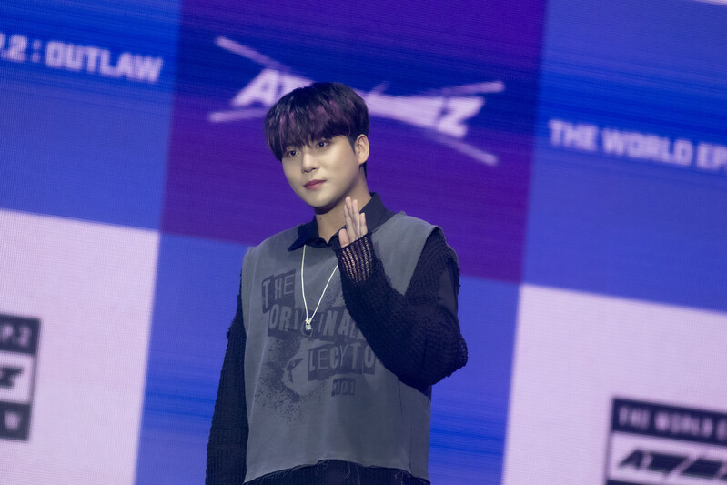 These photos taken during the media showcase of K-pop boy group ATEEZ's 9th mini album "The World Ep:2 : Outlaw" show members posing for their individual photos .
