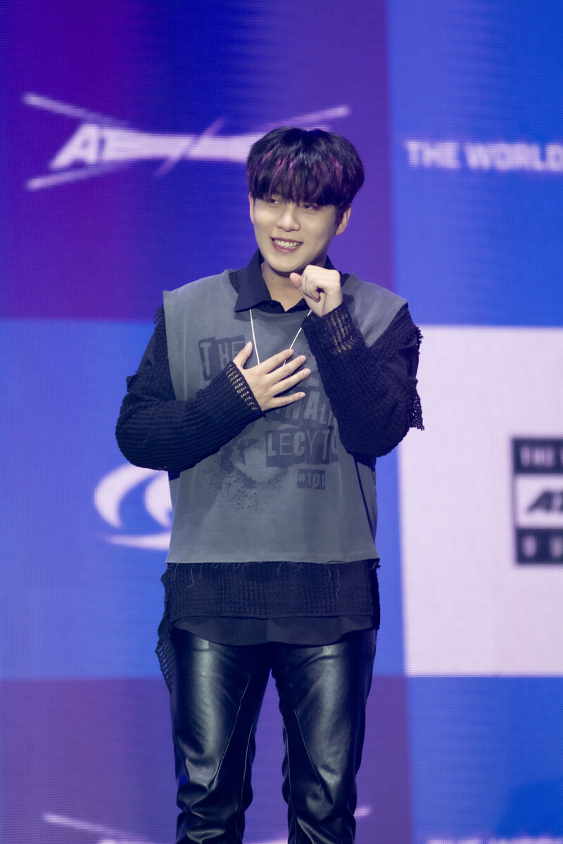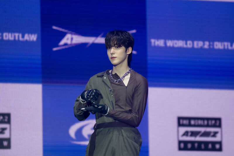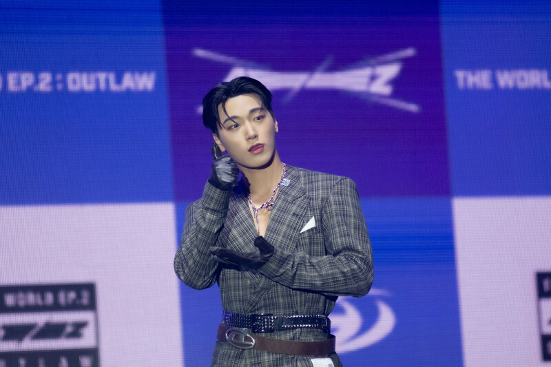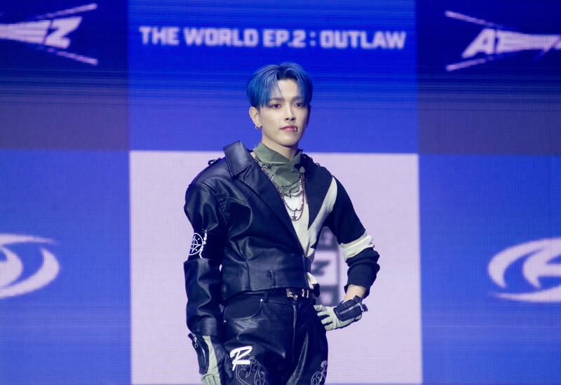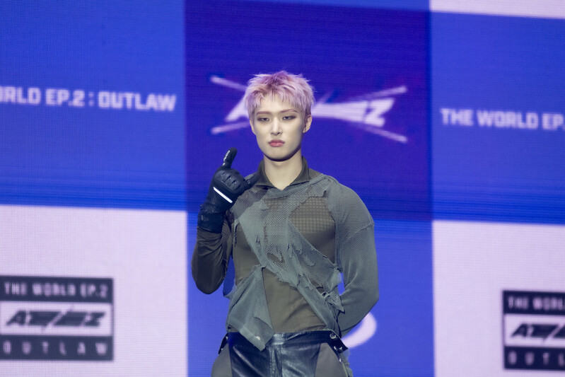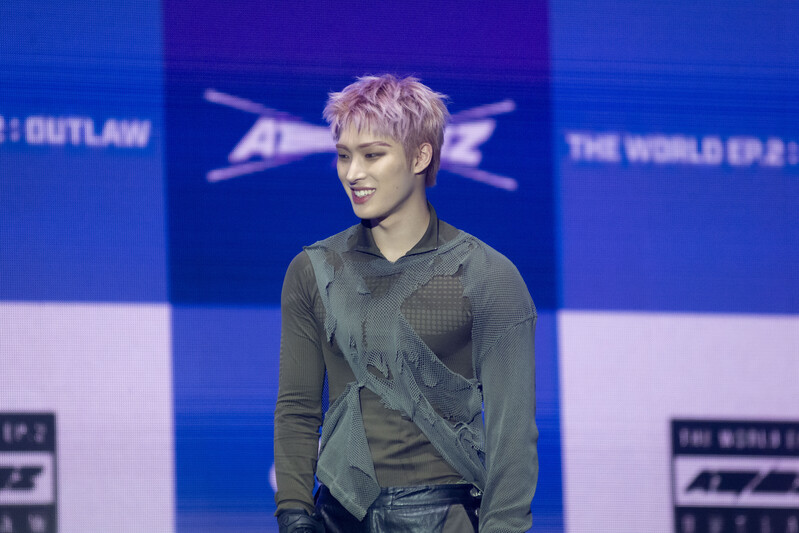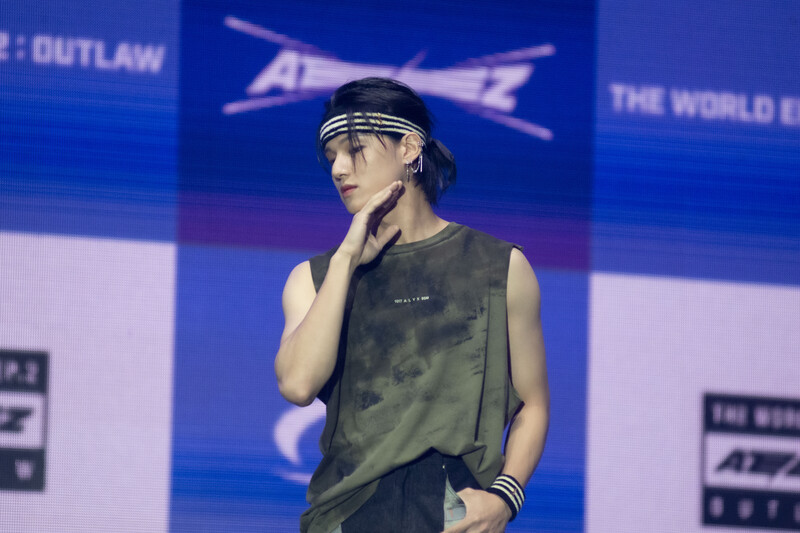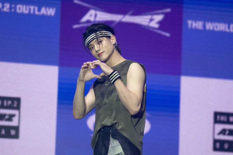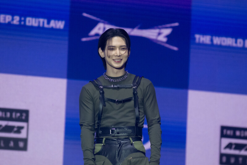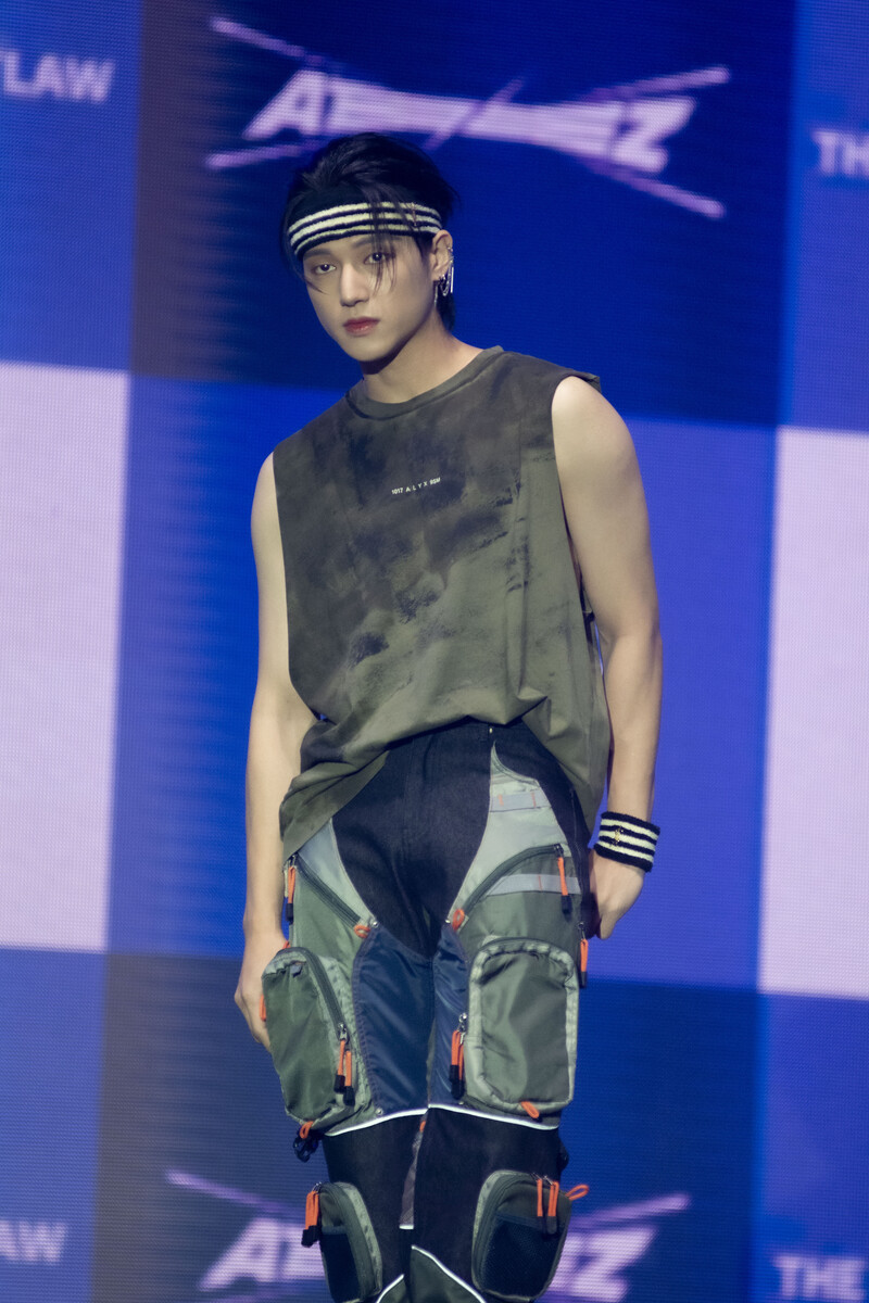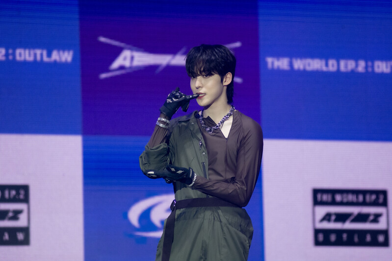 These photos taken during the media showcase of K-pop boy group ATEEZ's 9th mini album "The World Ep:2 : Outlaw" show members posing for their individual photos .