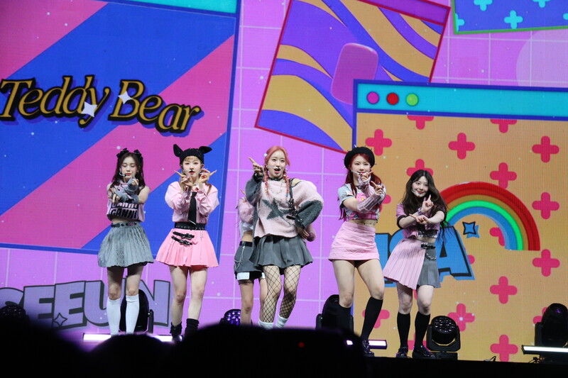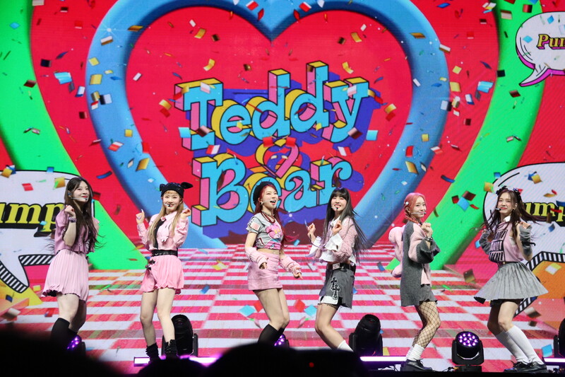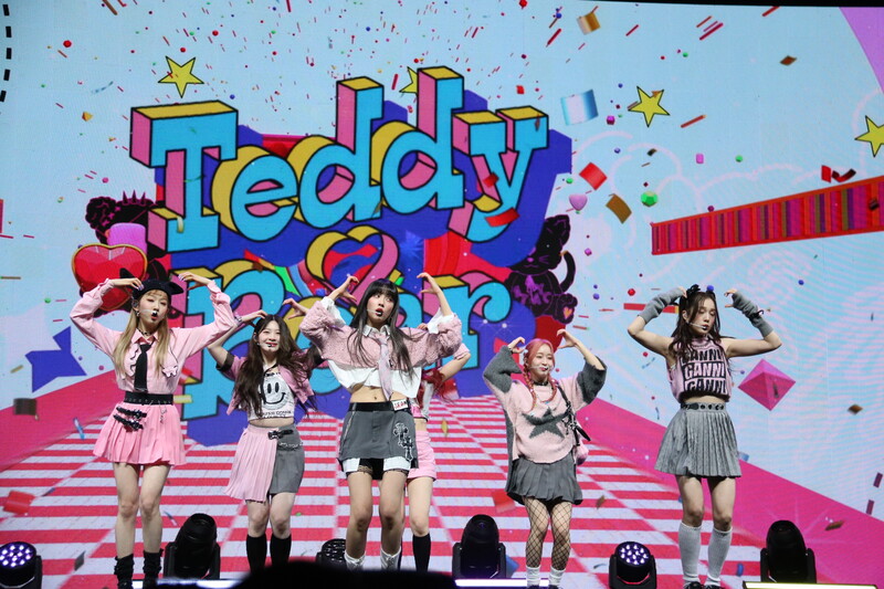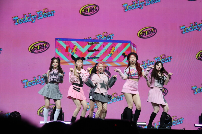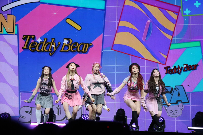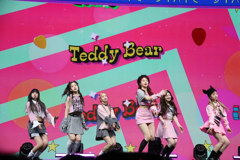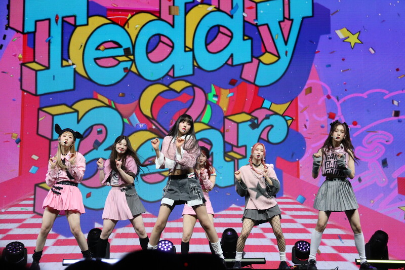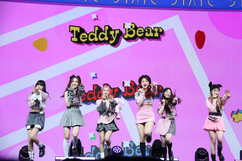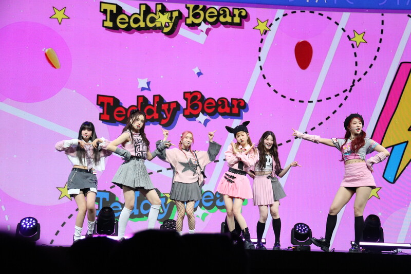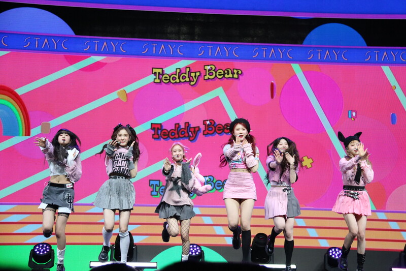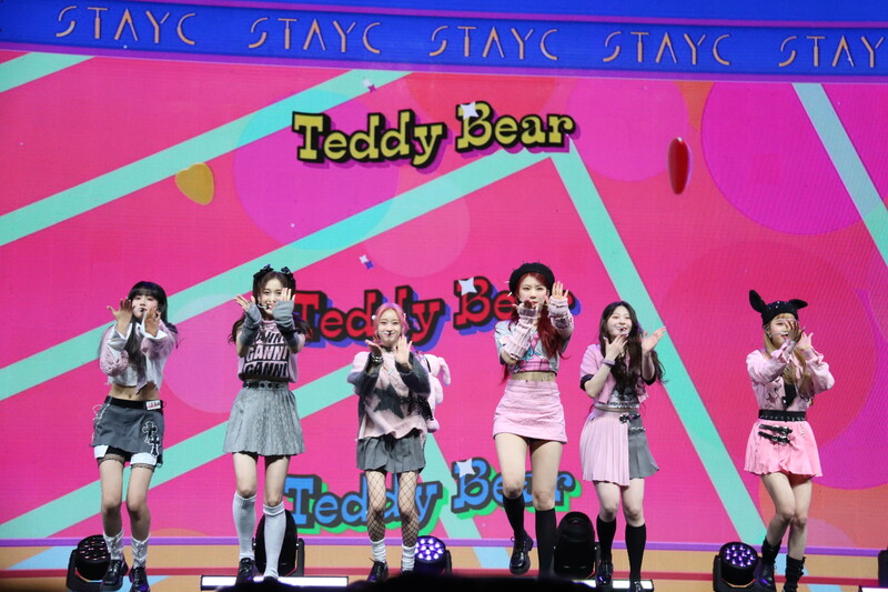 These photos show STAYC performing the song "Teddy Bear" during the media showcase of their 4th single album "Teddy Bear."