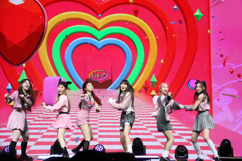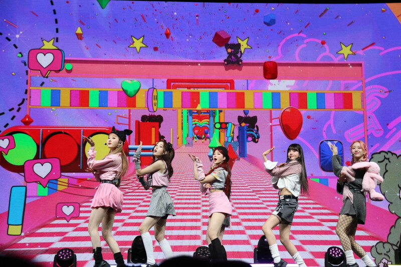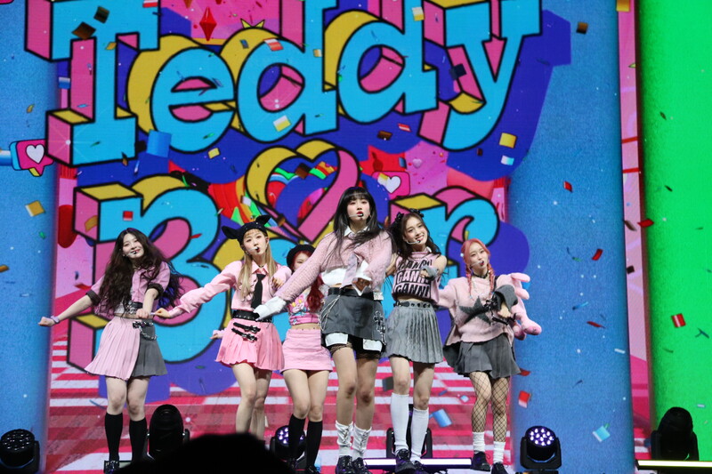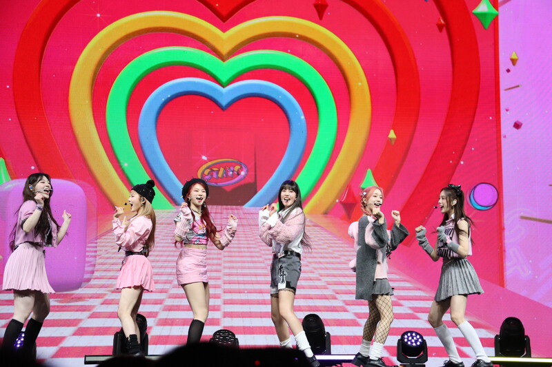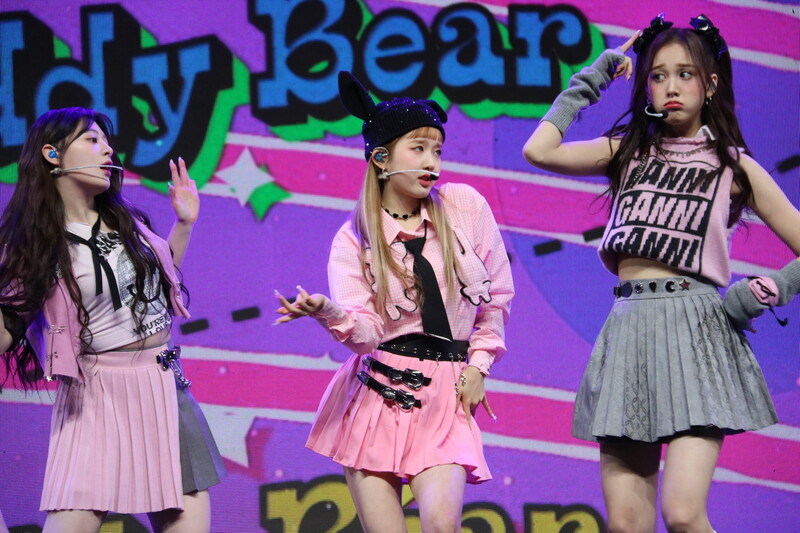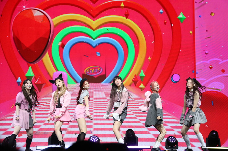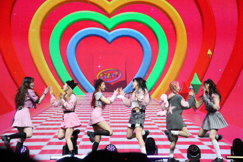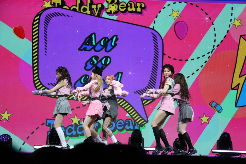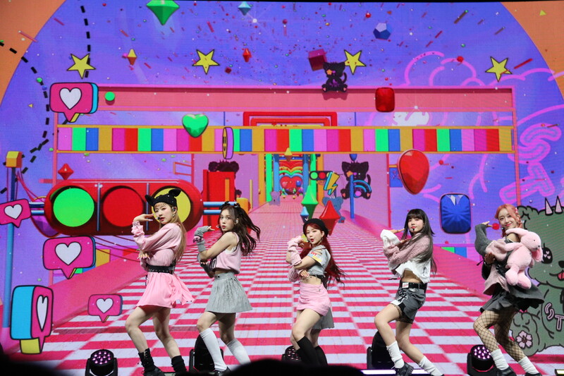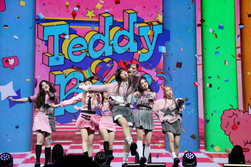 These photos show STAYC performing the song "Teddy Bear" during the media showcase of their 4th single album "Teddy Bear."