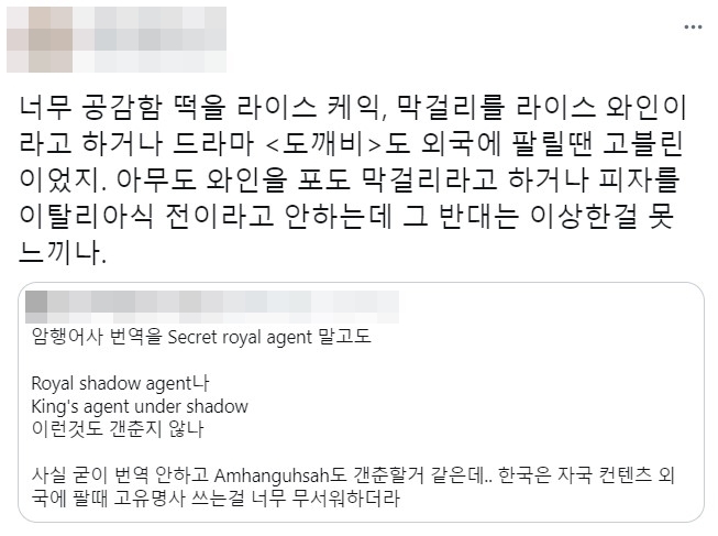 지난달 트위터에는 '전통문화를 외국식으로 번역해 한국 색채를 모두 지워버리니 외국에 뺏기기 쉬워진다'고 주장하는 글이 올라와 1만 번 이상 리트윗됐다.