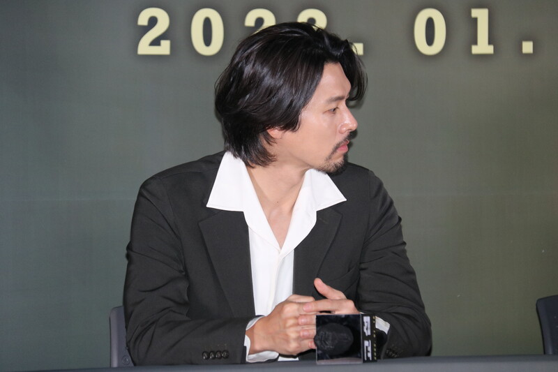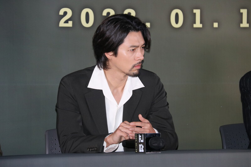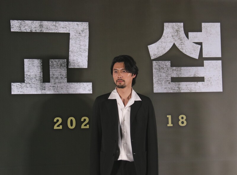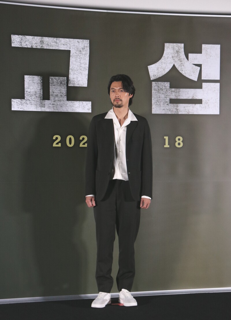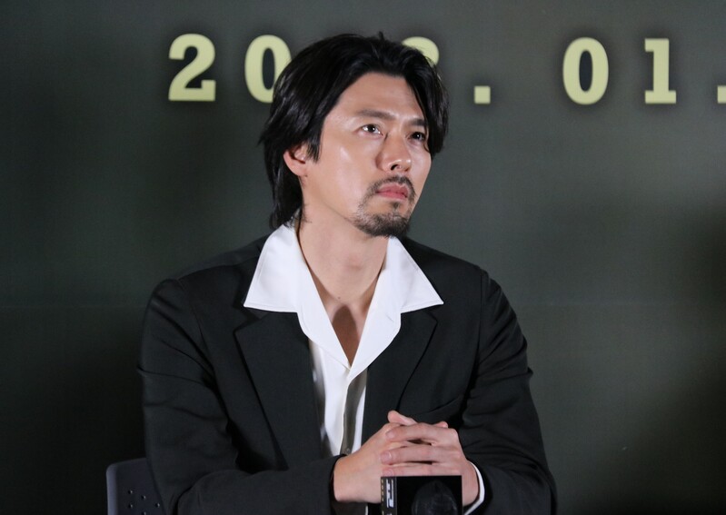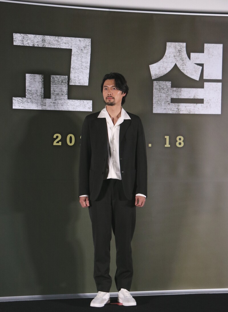 These photo taken during the press conference of the upcoming South Korean movie "The Point Man" show actor Hyun Bin answering to questions and taking photos in front of the photo wall.