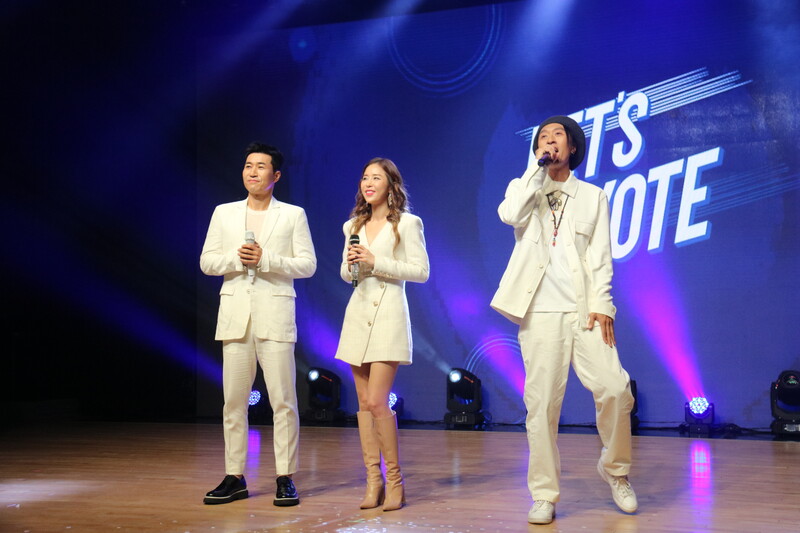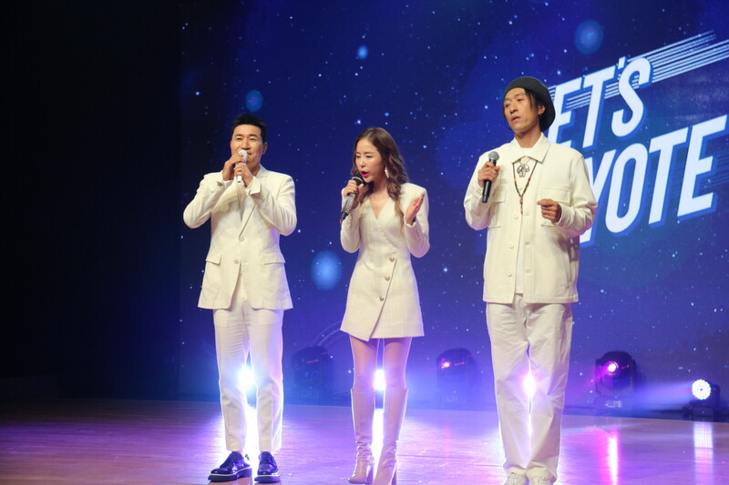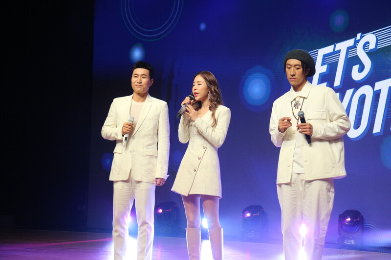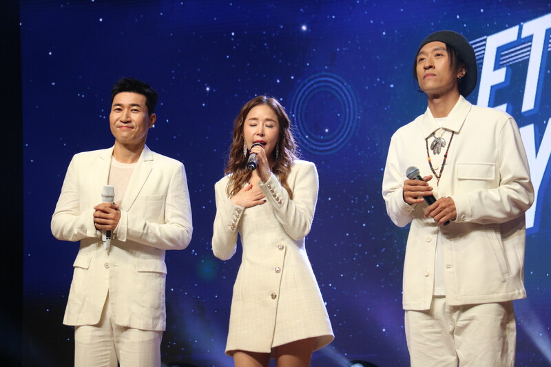 These photos taken during the media showcase of K-pop trio Koyote shows members performing their track half (literal translation) and participating in the question and answer session.