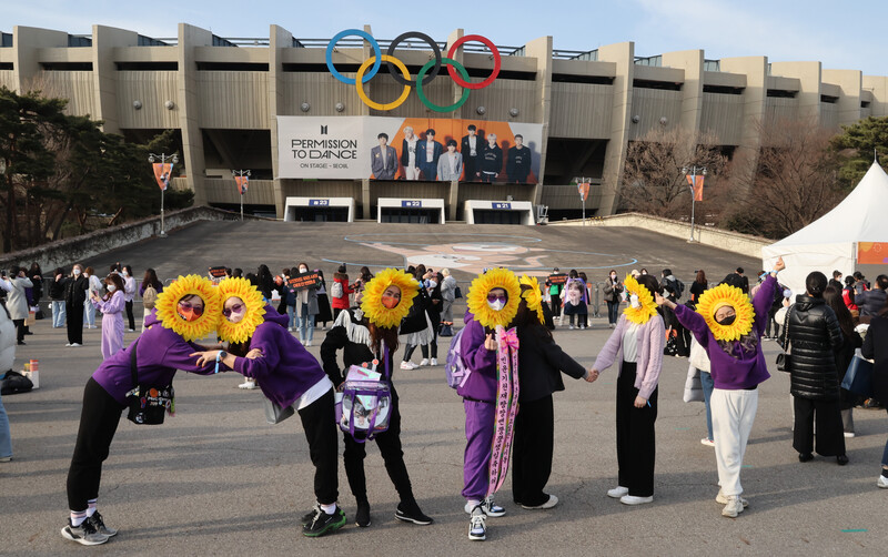 BTS fans pose in front of Jamsil Olympic Stadium in Seoul on March 10, 2022, where the septet will hold a concert, titled "BTS Permission to Dance on Stage - Seoul," later in the day. (Yonhap)