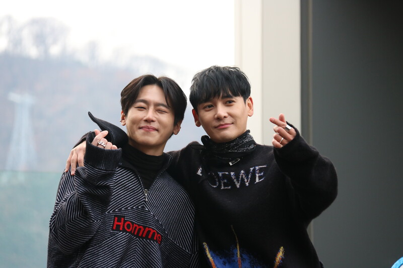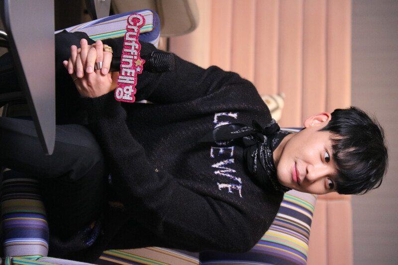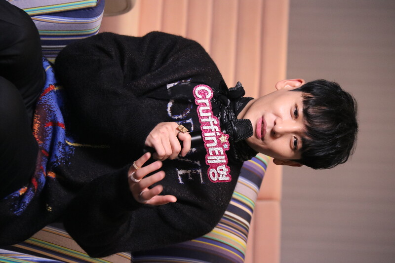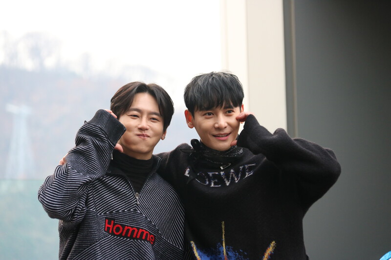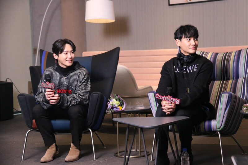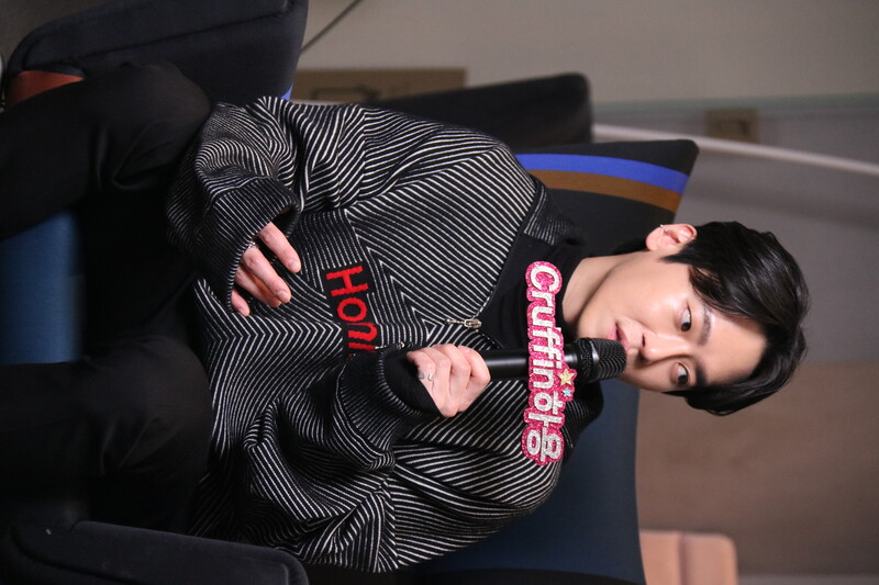 These photos show project group Cruffin, which consists of Kim Tae-hyung, a member Click-B and singer Ji Ha-yong, at the press conference for the release of carol "My Christmas."