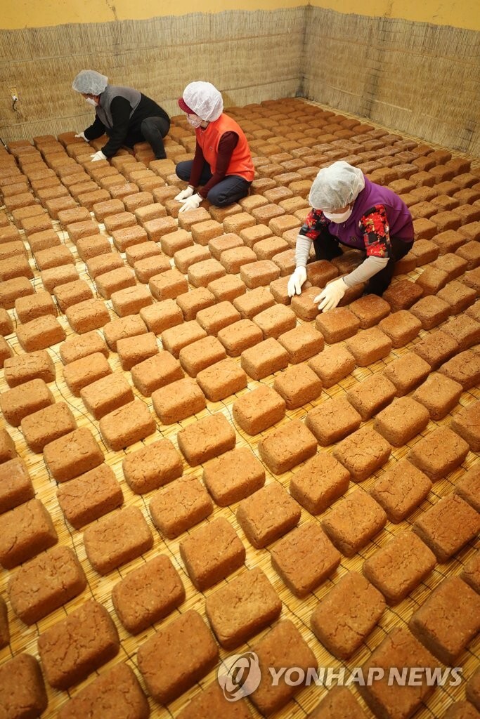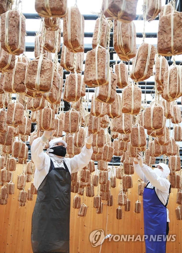 | ▲Employees inspect bricks of bean paste drying and ripening at the traditional sauce maker Seoil Farm in Anseong, 77 kilometers south of Seoul, on Dec. 14, 2021. The bricks, known as "meju," and salt, among other ingredients, are put into pots to make the Korean soybean paste "doenjang" and the traditional Korean soy sauce "ganjang." (Yonhap) |