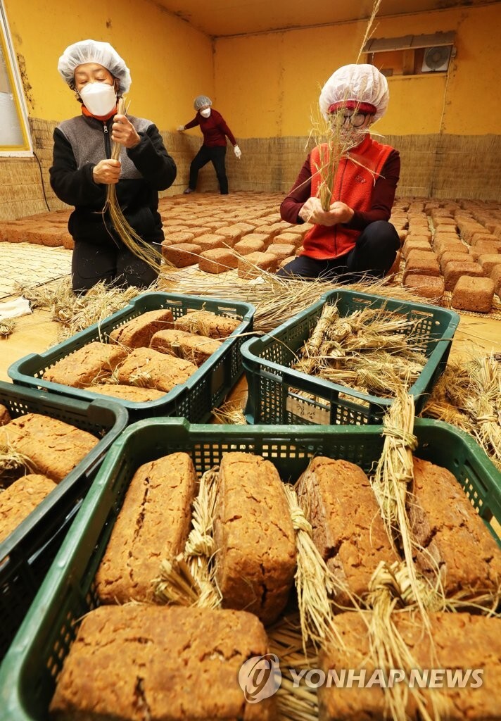 | ▲ Women tie bricks of bean paste with straw to mature them at a food company in Sejong, central South Korea, on Dec. 11, 2020. The bricks, known as "meju," and salt, among other ingredients, are put into pots to make the Korean soybean paste "doenjang" and the traditional Korean soy sauce "ganjang." (Yonhap) |