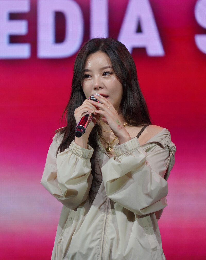 These photos, provided by RBW, show mamamoo during their 12th mini album "MIC_ON" media showcase.