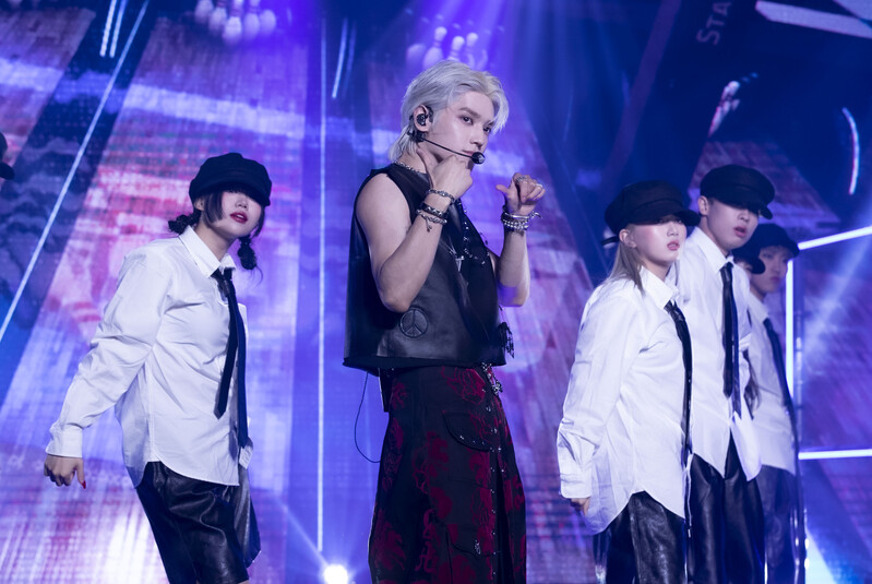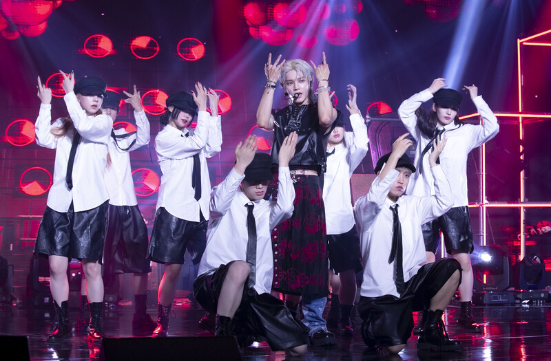 These photos taken during the media showcase of Taeyong's first solo album "Shalala" show Taeyong performing his title track "Shalala."