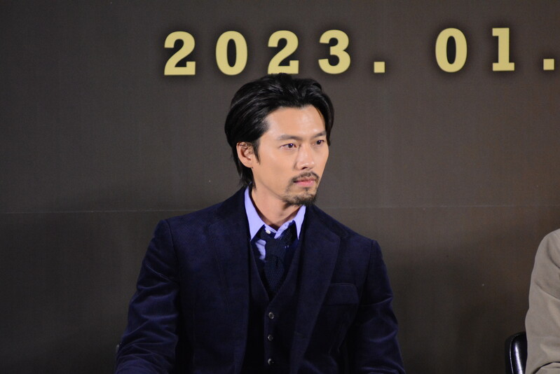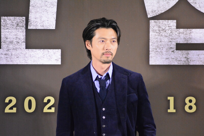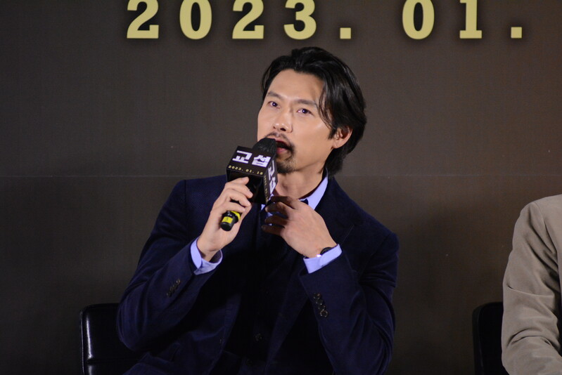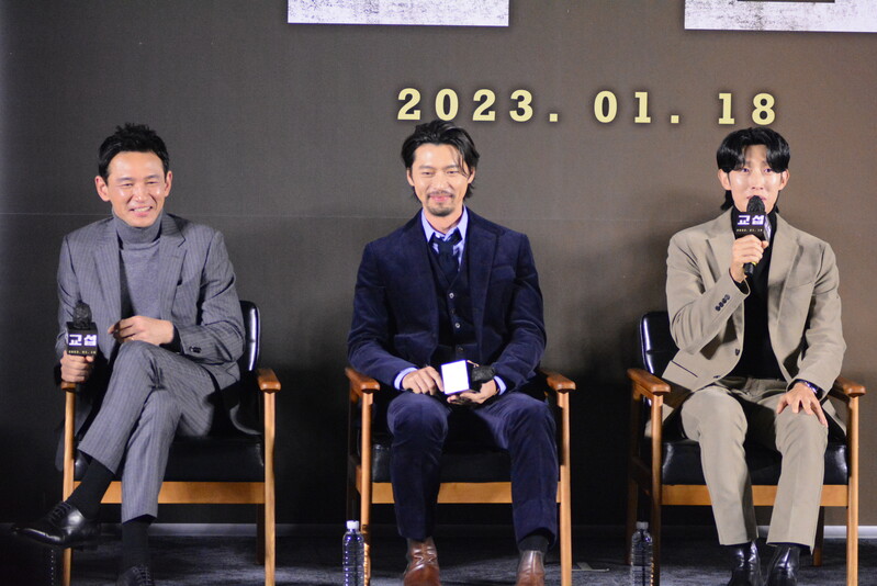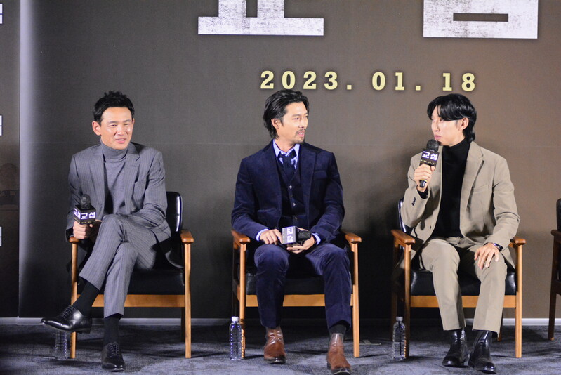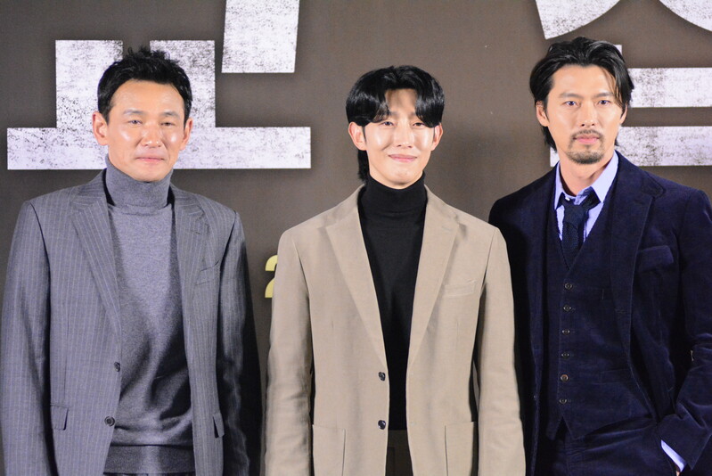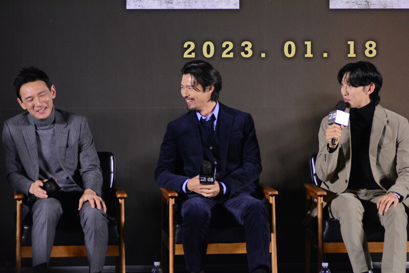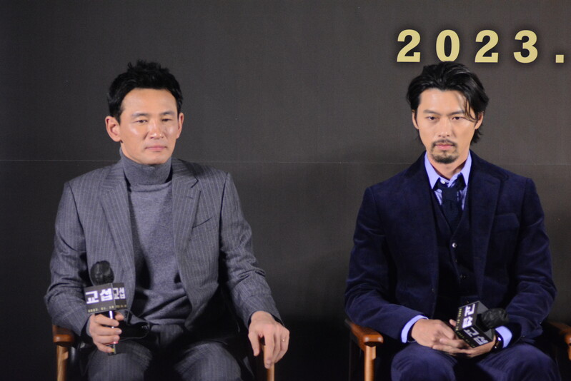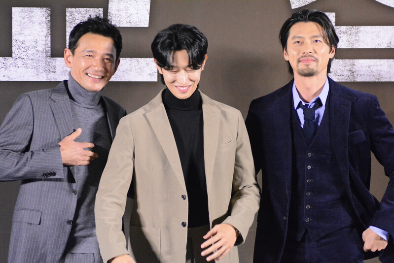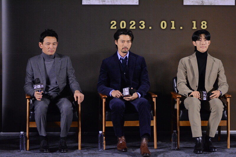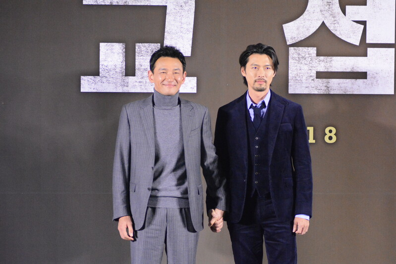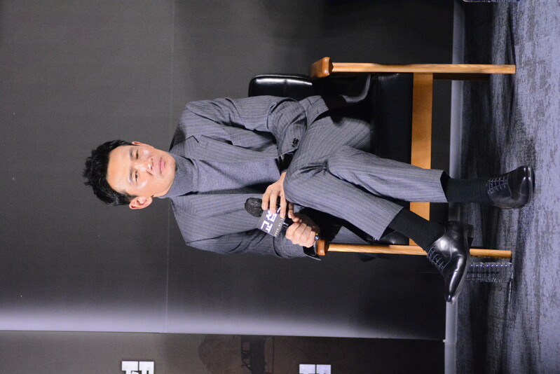 These photos taken during the press conference of the upcoming South Korean Movie "The Point Men" show actor Hyun Bin, Hwang Jung-min, and Kang Ki-young posing for individual, group photos and answering to questions.