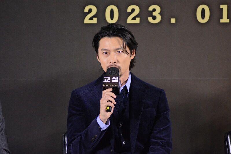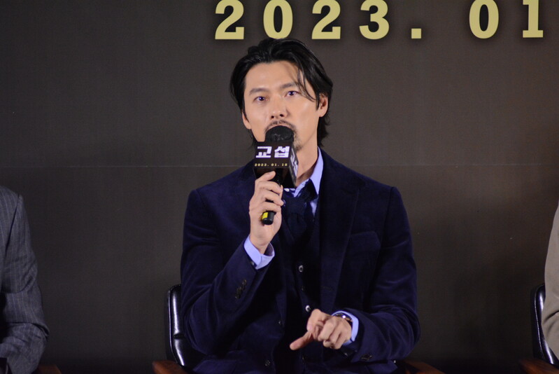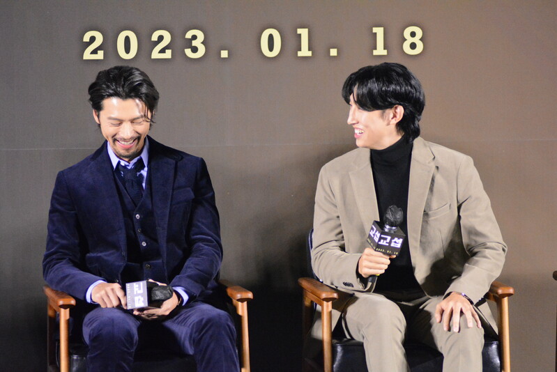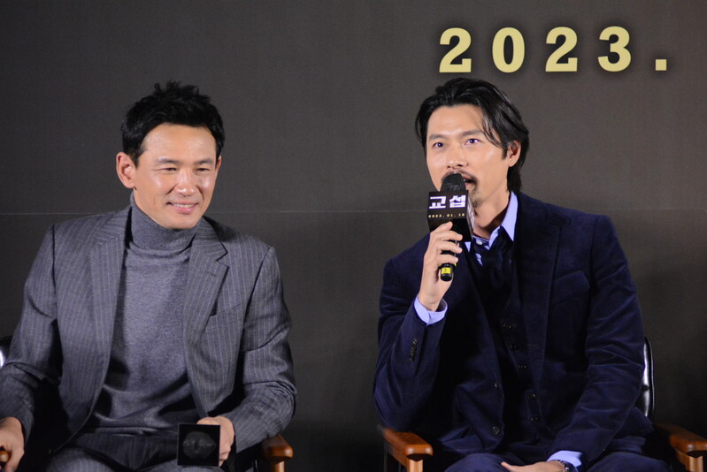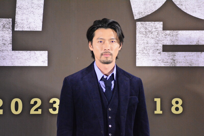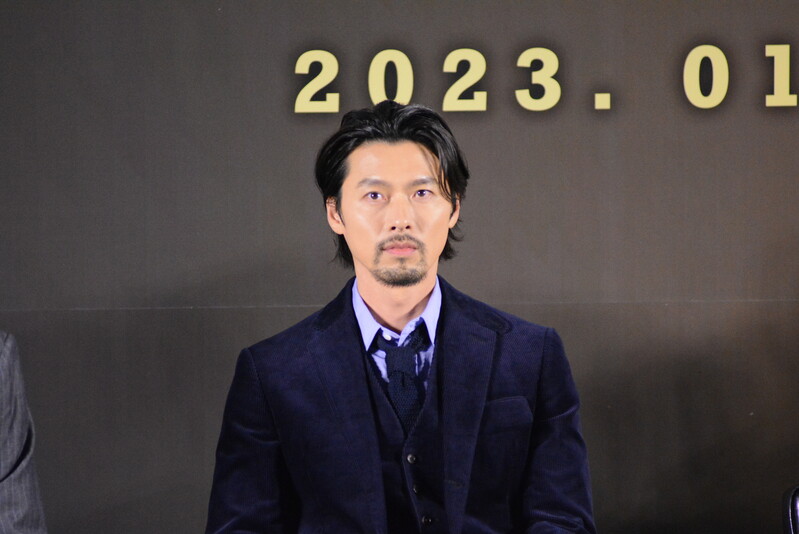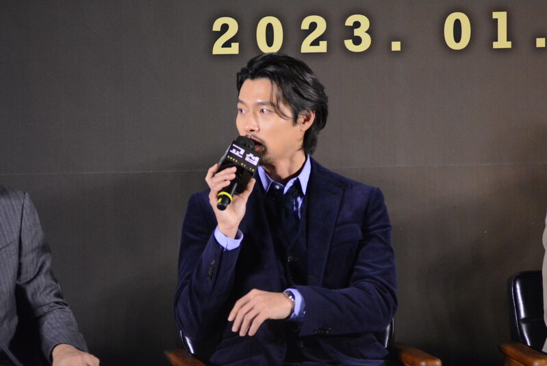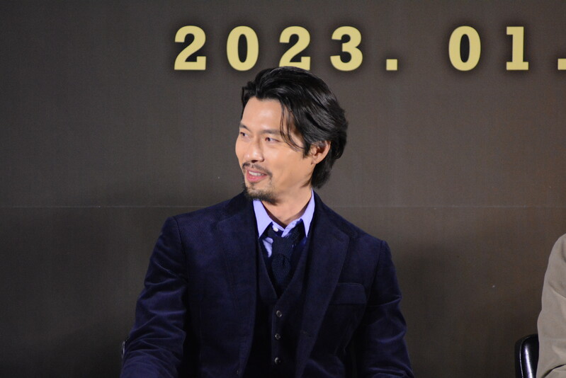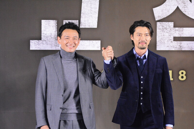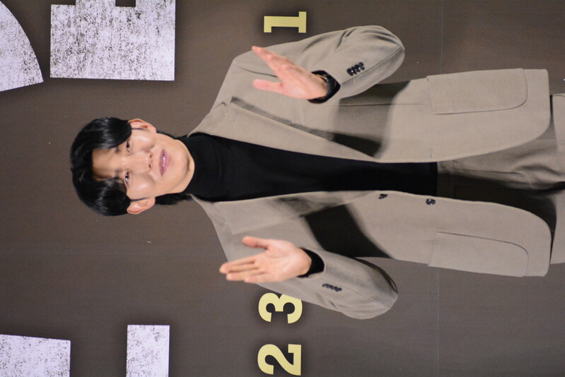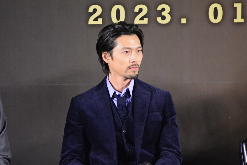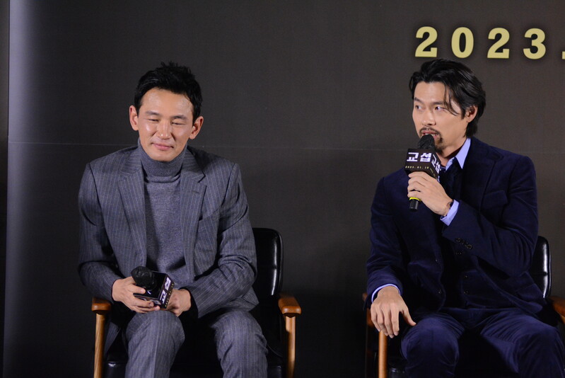 These photos taken during the press conference of the upcoming South Korean Movie "The Point Men" show actor Hyun Bin, Hwang Jung-min, and Kang Ki-young posing for individual, group photos and answering to questions.