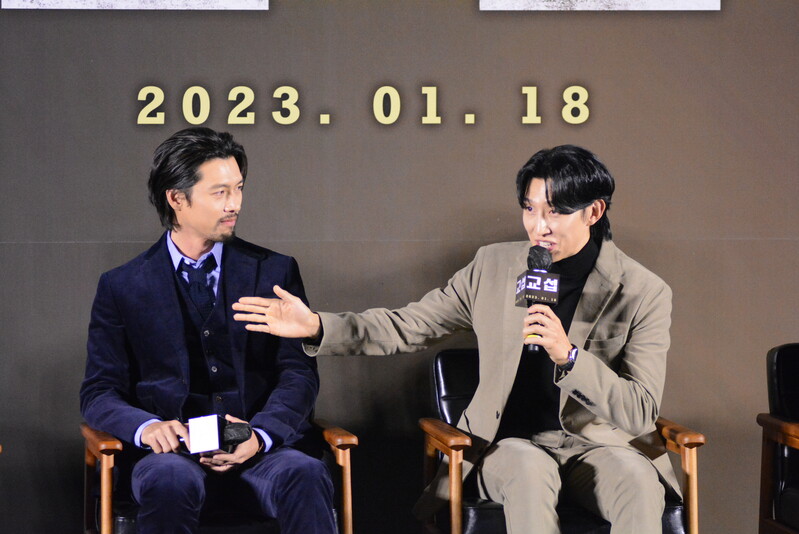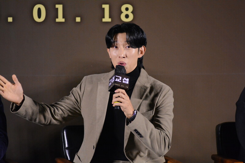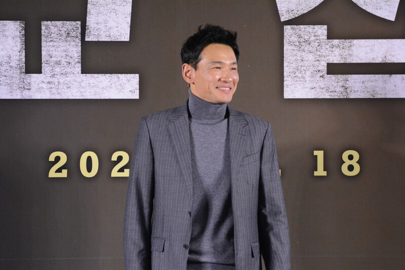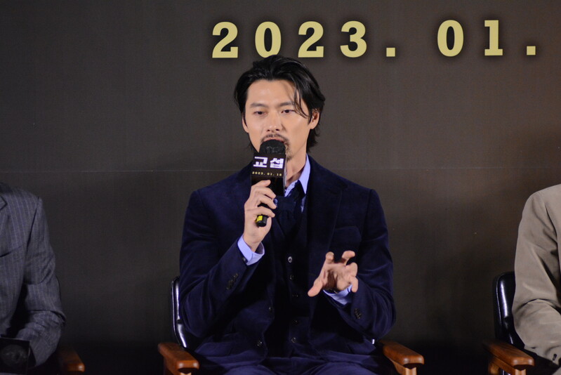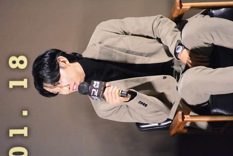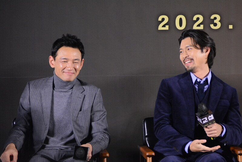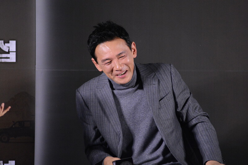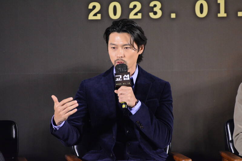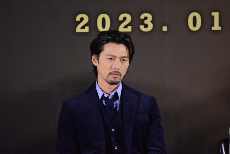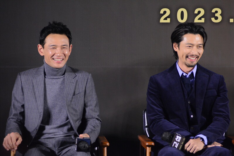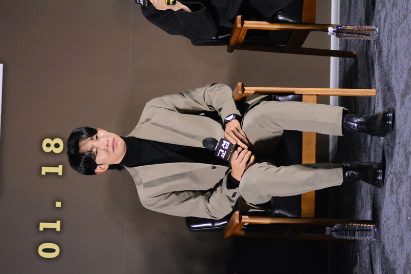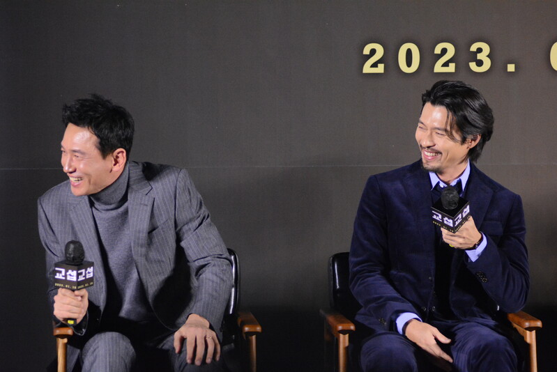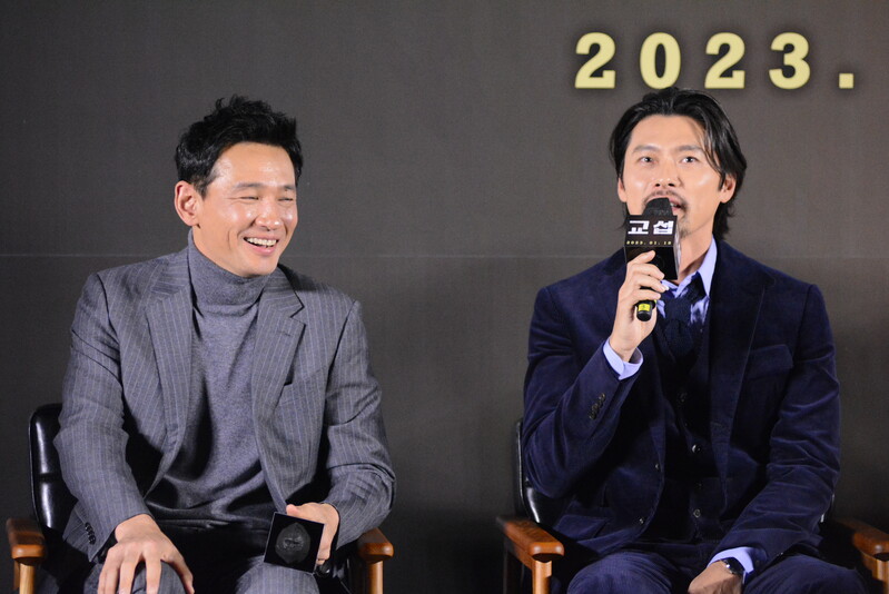 These photos taken during the press conference of the upcoming South Korean Movie "The Point Men" show actor Hyun Bin, Hwang Jung-min, and Kang Ki-young posing for individual, group photos and answering to questions.