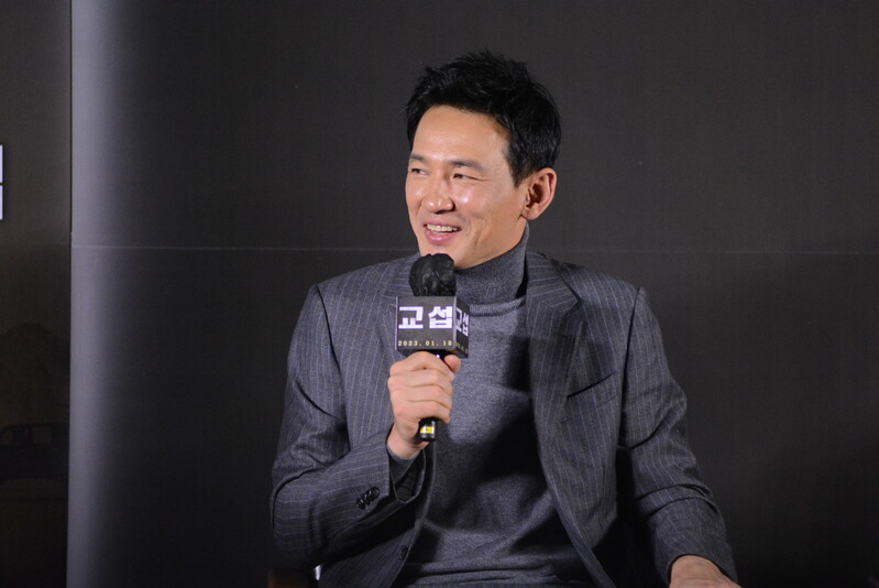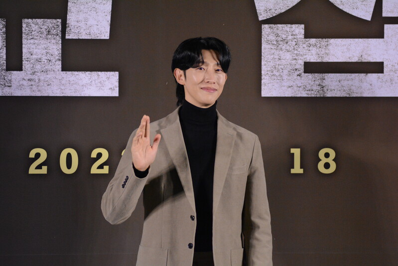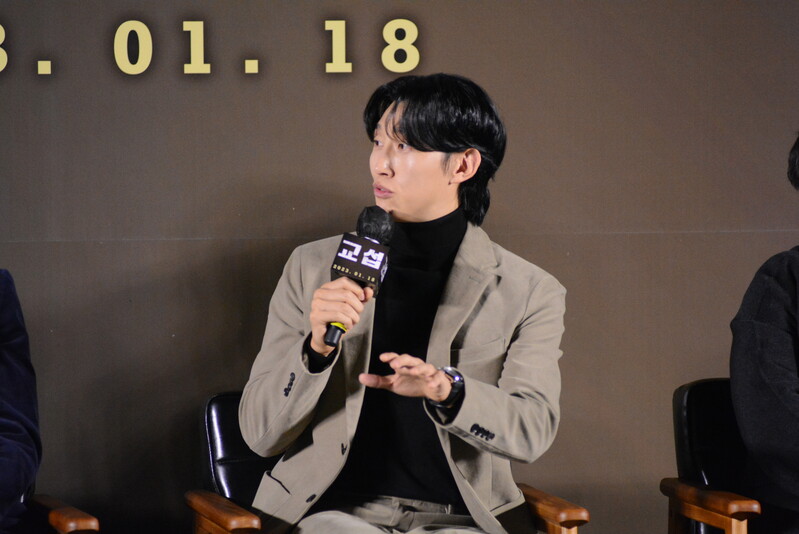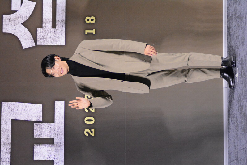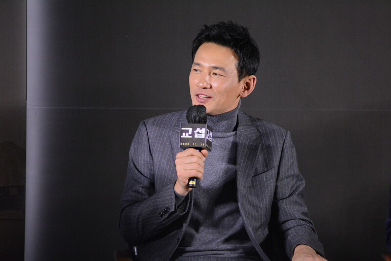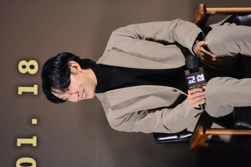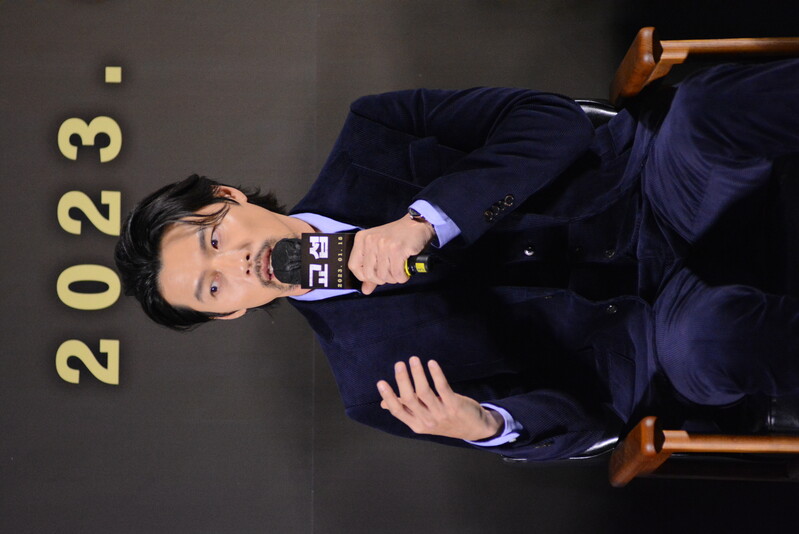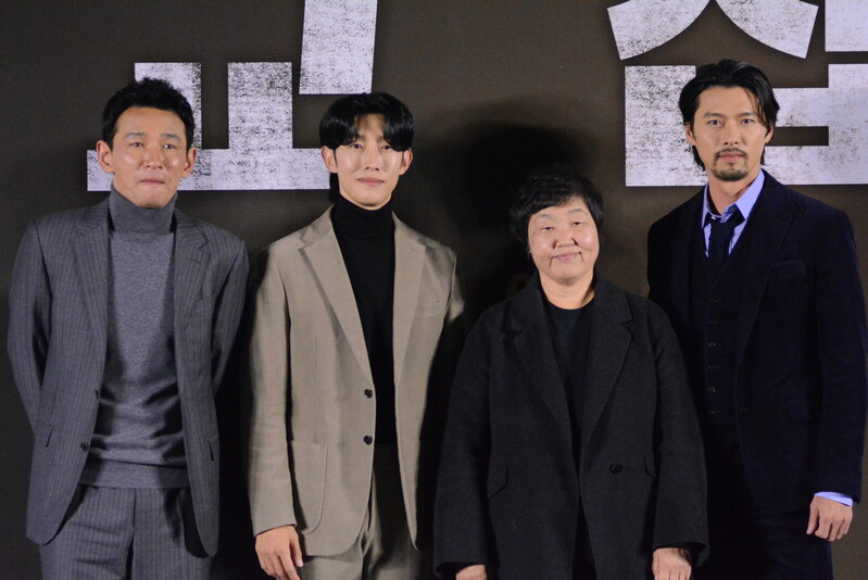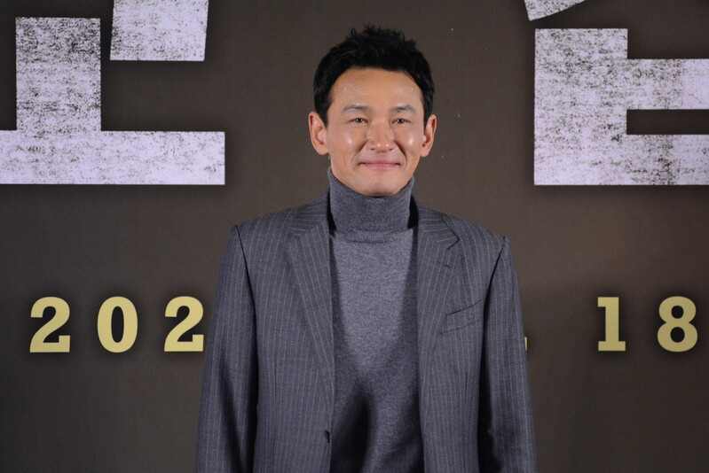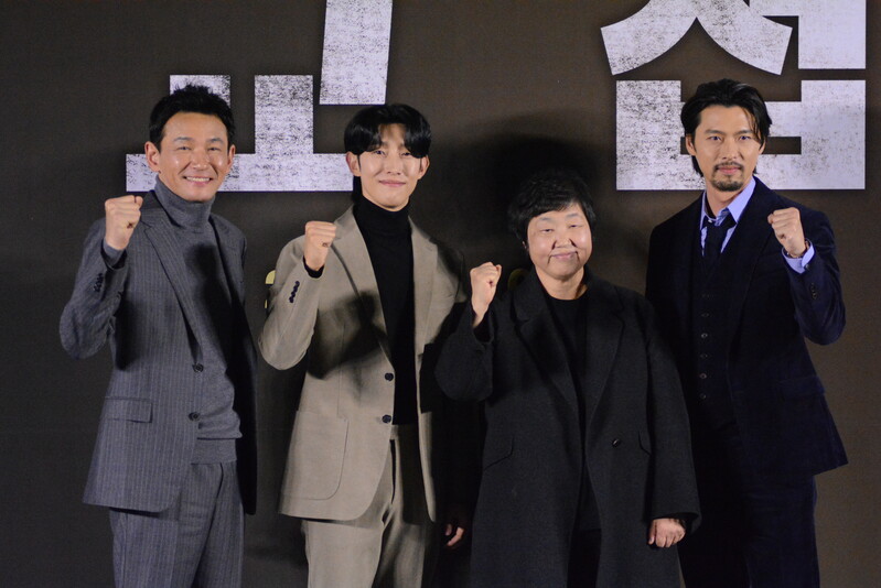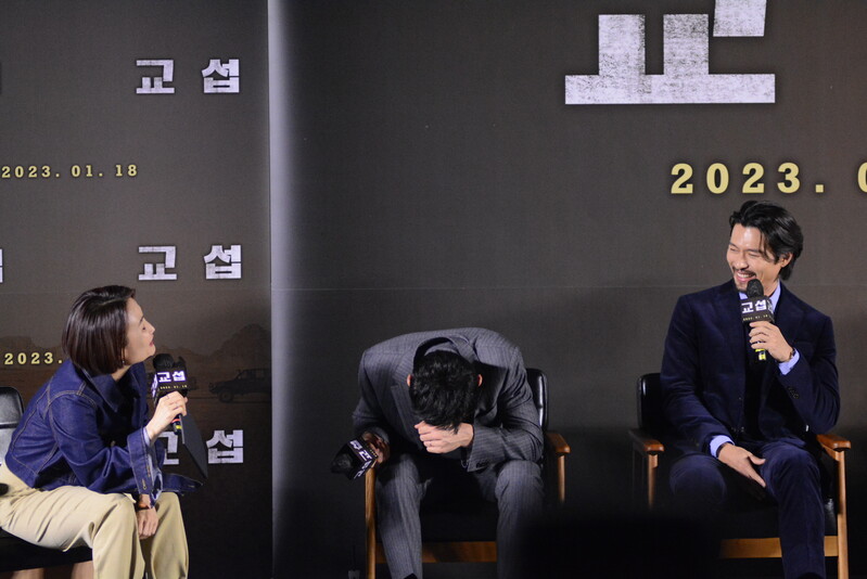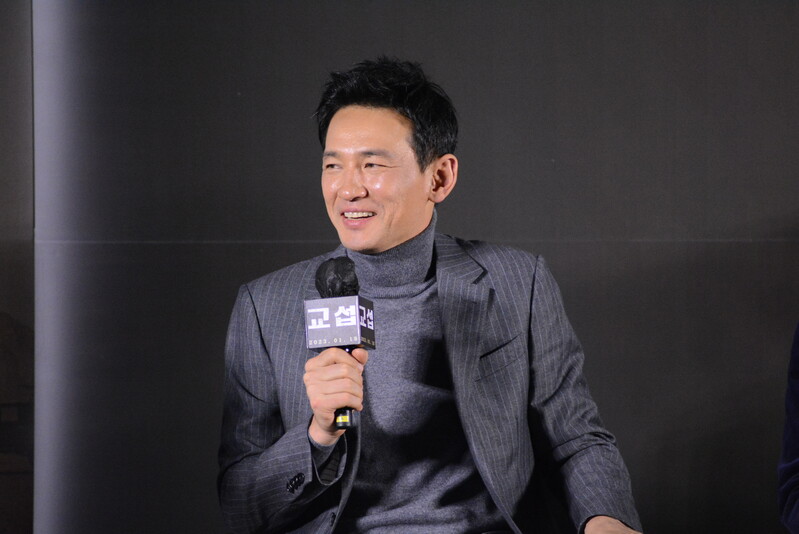 These photos taken during the press conference of the upcoming South Korean Movie "The Point Men" show actor Hyun Bin, Hwang Jung-min, and Kang Ki-young posing for individual, group photos and answering to questions.