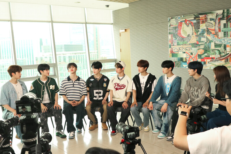 These photos, taken during the interview of K-pop boy group LUN8 shows Jin Su, Chael, Takuma, Jun Woo, Do Hyun, Ian, Ji Eun-ho, and Eun Seop throughout the event.