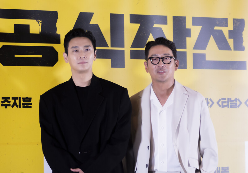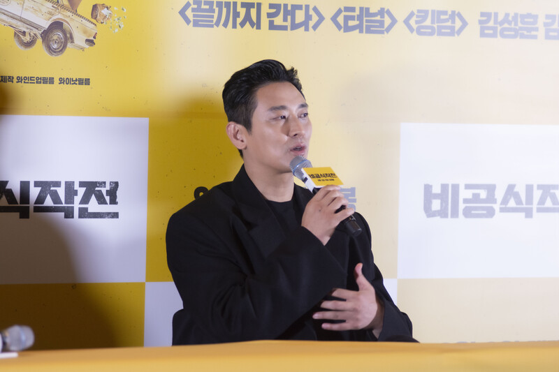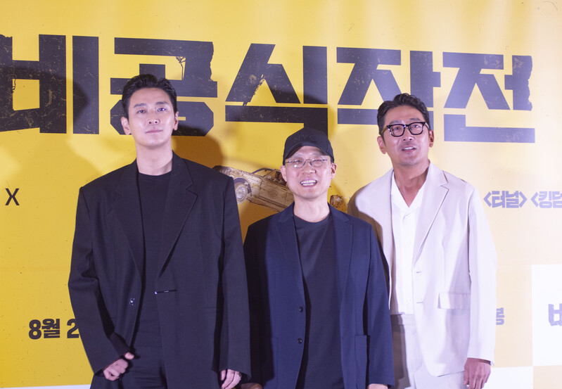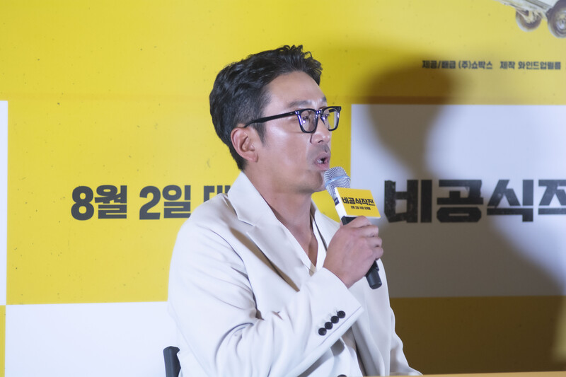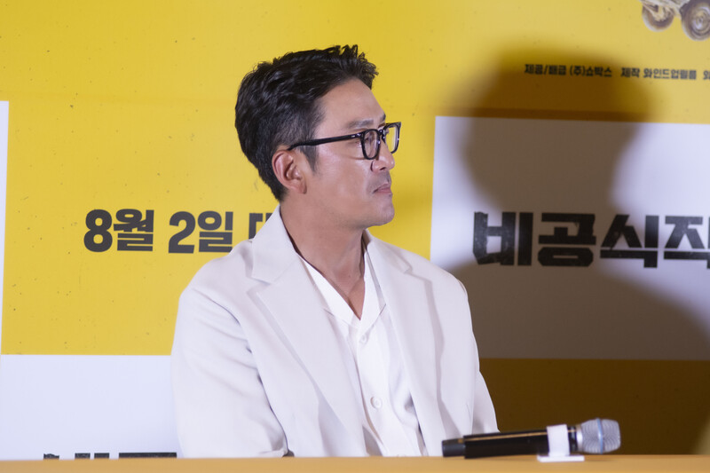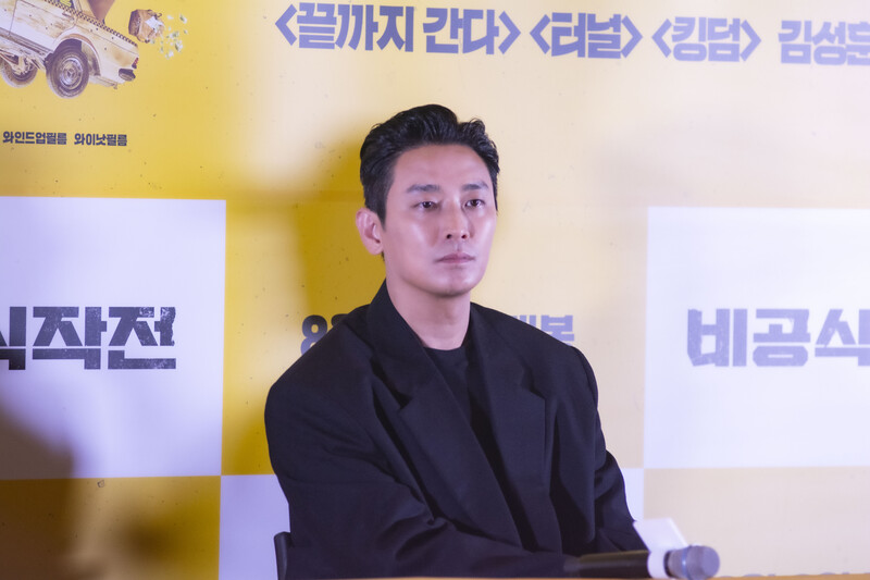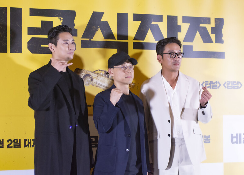 These photos taken during the press conference of upcoming South Korean movie "Ransomed" show cast members participating in the event.