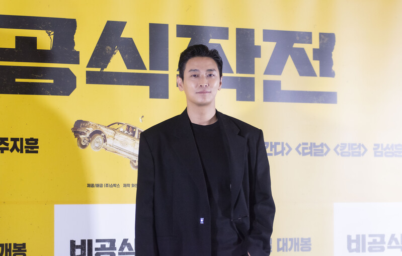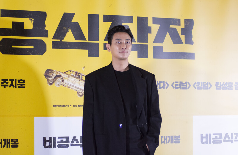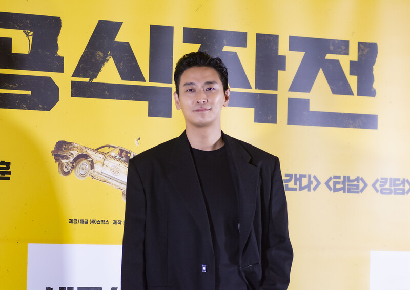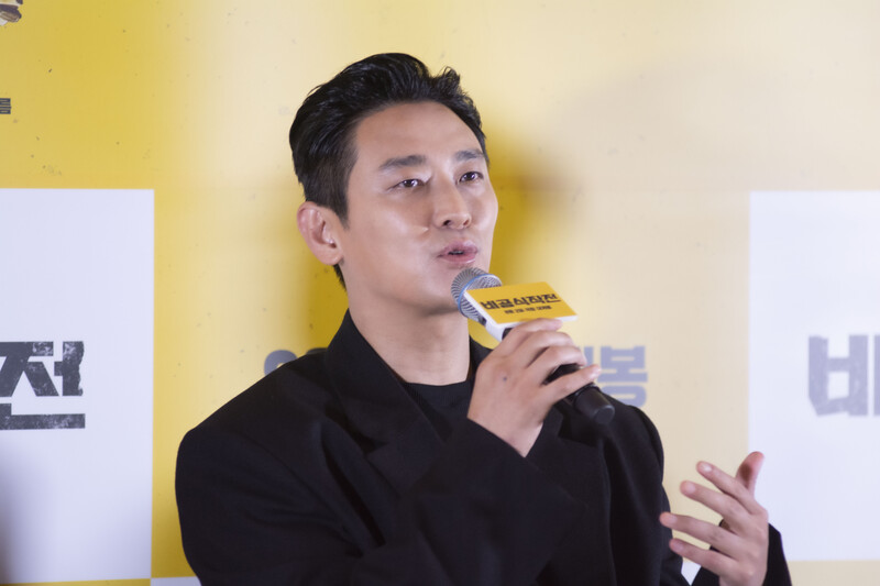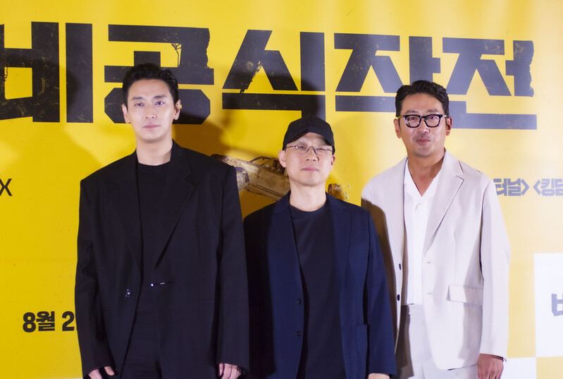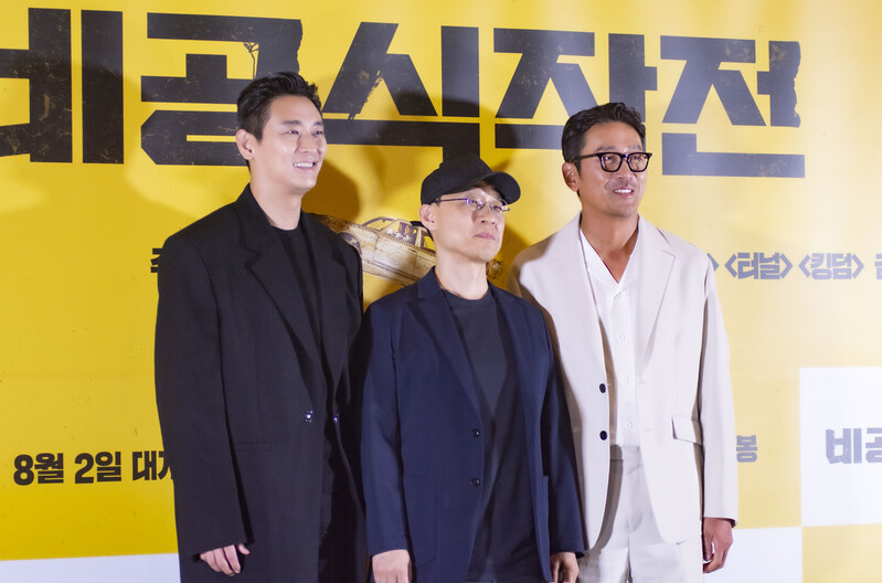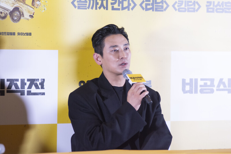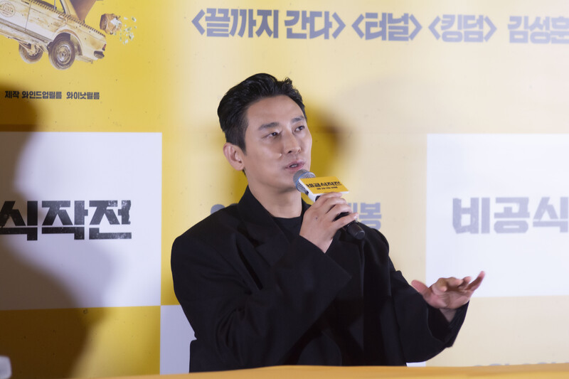 These photos taken during the press conference of upcoming South Korean movie "Ransomed" show cast members participating in the event.