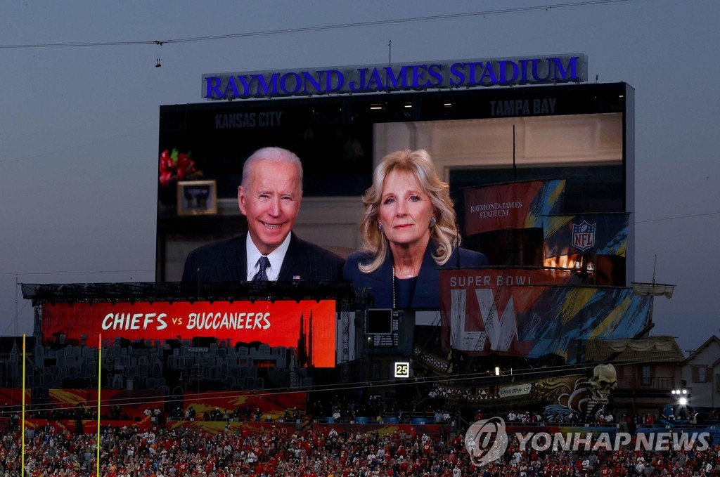 | ▲ 슈퍼볼 경기장에서 연설하는 조 바이든 미국 대통령 부부 7일(현지시간) 미국프로풋볼(NFL) 챔피언결정전(슈퍼볼)이 열린 플로리다주 탬파의 레이먼드 제임스 스타디움에서 전광판을 통해 조 바이든 미국 대통령 부부가 연설하고 있다. [[AFP=연합뉴스] |