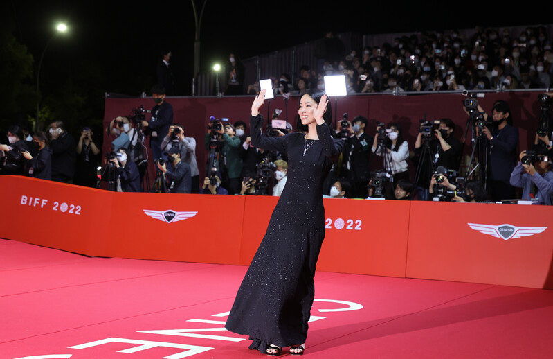South Korean actress Jeon Yeo Been poses for a photo on the red carpet during the opening ceremony of this year's 27th Busan International Film Festival (BIFF) held at the Busan Cinema Center in the southeastern port city of Busan on Oct. 5, 2022. (Yonhap)