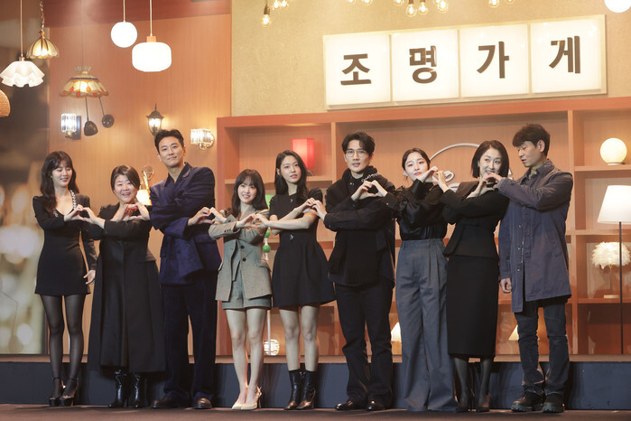 The stars of the new drama "Light Shop" an original series by Disney+ -- Shin Eun-soo, Lee Jung-eun, Joo Ji-hoon, Park Bo-young, Kim Seol-hyun, Um Tae-koo, Kim Min-ha, Kim Sun-hwa and Park Hyuk-kwon (L to R) -- pose for a photo during a publicity event in Seoul on Dec. 3, 2024. The first episode of the series will be available on Dec. 4. (Yonhap)