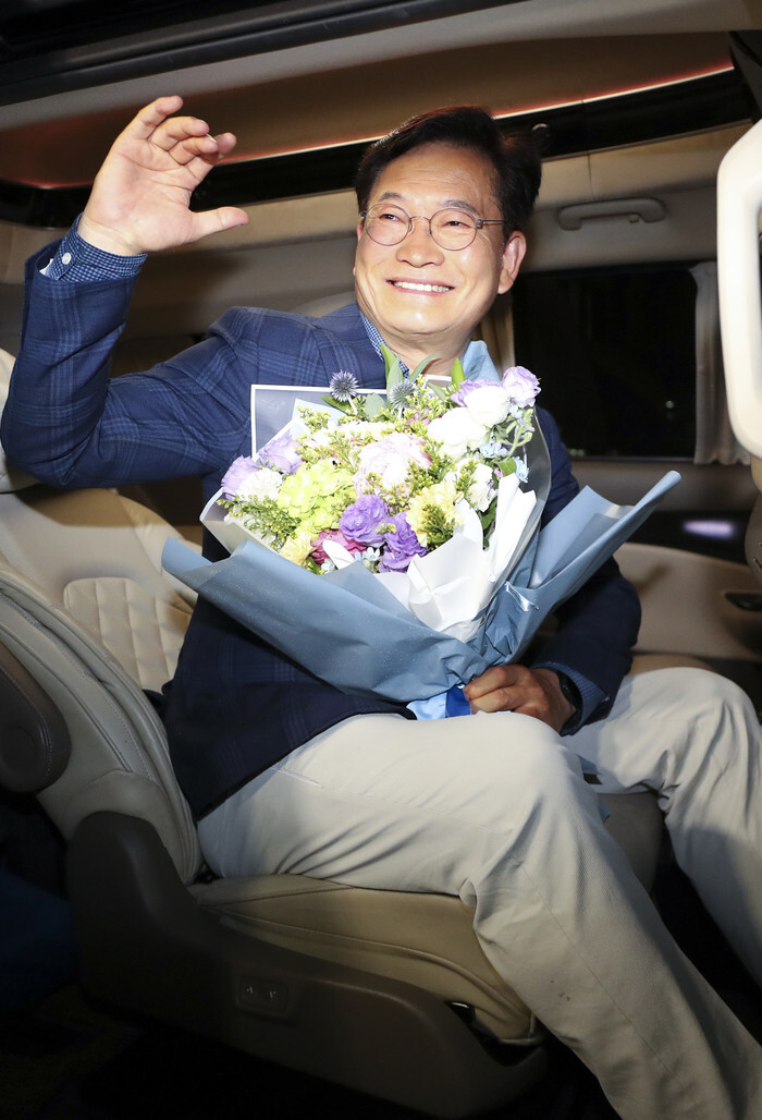 Song Young-gil, the candidate of the main opposition Democratic Party in the Seoul mayoral election, sits in a car as he leaves his campaign office in Seoul on June 1, 2022, after conceding defeat to incumbent Oh Se-hoon of the ruling People Power Party in the race held as part of the local elections to elect mayors, governors, education superintendents and leaders of local councils. (Pool photo) (Yonhap)