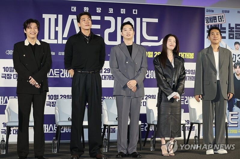▲ Actors Kang Ha-neul, Kim Young-kwang, Kang Young-seok, Han Sun-hwa and director Nam Dae-jung (from L to R) pose for photos at a press conference for "The First Ride" in Seoul on Sept. 25, 2025. (Yohap)