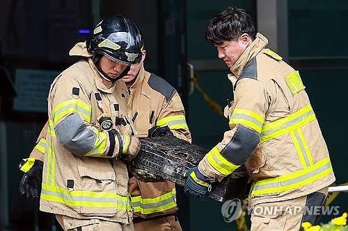 | ▲ Firefighters carry a battery that caught on fire at the National Information Resources Service in Daejeon, about 140 kilometers south of Seoul, on Sept. 27, 2025. (Yonhap) |