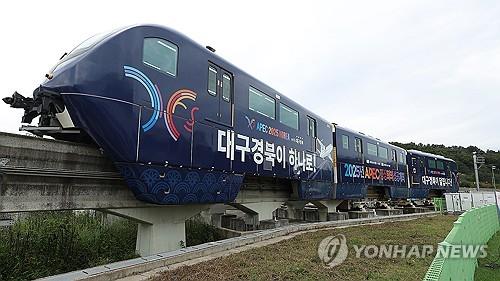 | ▲ Daegu Metro Line 3 unveils a monorail train wrapped with promotional materials for the upcoming Asia-Pacific Economic Cooperation summit at a vehicle depot on Sept. 22, 2025, as part of an event wishing for South Korea's successful hosting of the summit. The train will remain in service until Nov. 1, the last day of the two-day summit in Gyeongju, 330 kilometers southeast of Seoul. (Yonhap) |