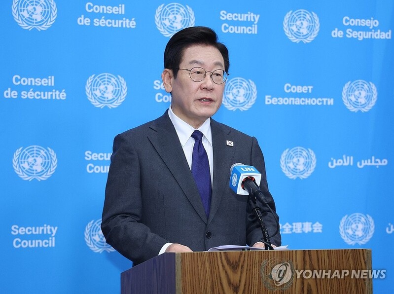 | ▲ President Lee Jae Myung speaks during a press briefing ahead of an open debate of the United Nations Security Council at U.N. headquarters in New York on Sept. 24, 2025. (Yonhap) |