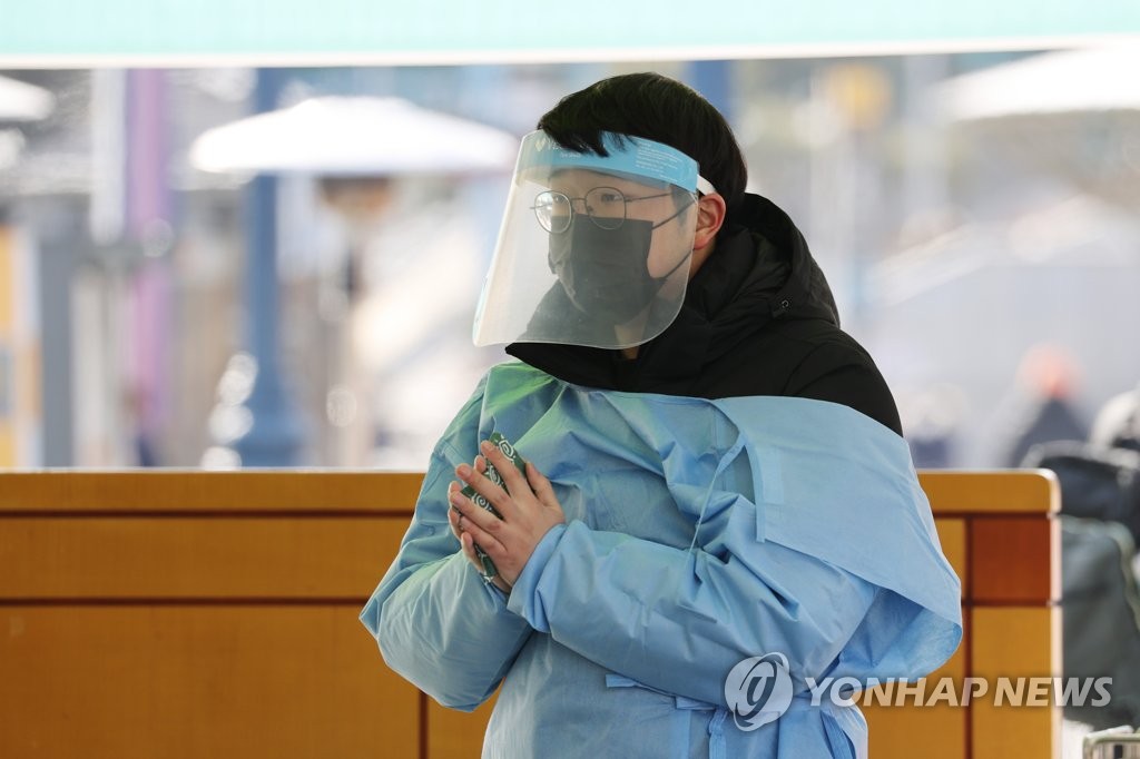 ▲ A medical staff member works at a makeshift clinic in central Seoul on Jan. 9, 2021 (Yonhap)