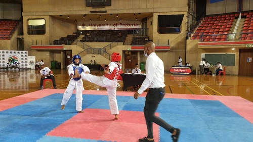 (프리토리아=연합뉴스) 김성진 특파원 = 남아프리카공화국에서 지난해 신종 코로나바이러스 감염증(코로나19)으로 열리지 못했던 한국대사배 태권도대회가 23일(현지시간) 프리토리아 대학 체육관에서 열렸다.