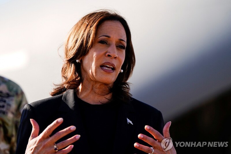 ▲ U.S. Vice President Kamala Harris speaks to the members of the media, following a briefing with officials, in the wake of Hurricane Helene in Charlotte, North Carolina, on Oct. 5, 2024 in this photo released by Reuters. (Yonhap)