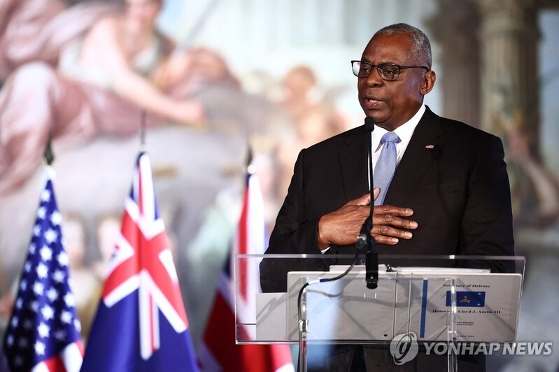 ▲ U.S. Defense Secretary Lloyd Austin speaks during a joint press conference during the AUKUS Defense Ministerial Meeting in London on Sept, 26, 2024 in this photo released by AFP. (Yonhap)