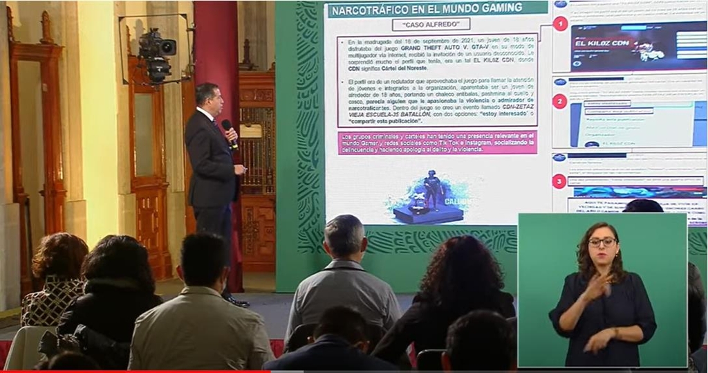 | ▲ 게임을 통한 범죄조직의 미성년자 유인 사례 소개하는 멕시코 정부 관계자 [멕시코 대통령실 유튜브 영상 캡처. 재판매 및 DB 금지] |