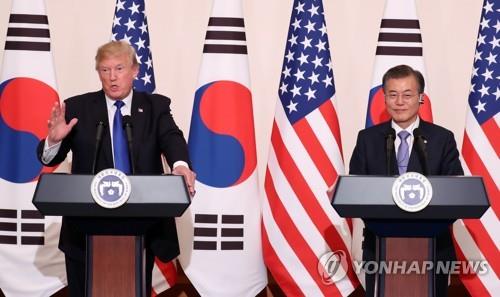 ▲ South Korean President Moon Jae-in (R) and U.S. President Donald Trump hold a joint conference following their bilateral summit at the South Korean presidential office Cheong Wa Dae in Seoul, in this Nov. 7, 2017, file photo. (Yonhap)