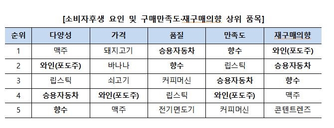 포도주와 향수, 승용자동차는 다양성, 가격, 품질 등 3가지 요인과 만족도, 재구매 의향을 포함한 5가지 항목 중 4개 항목에서 긍정적인 평가 비율이 상위권으로 나타나 FTA로 인한 소비자 후생 효과가 높은 것으로 조사됐다.