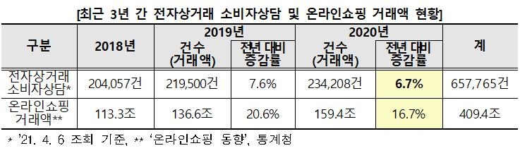 온라인 쇼핑 거래액이 2018년 113조3천억원에서 2019년 136조6천억원, 지난해 159조4천억원으로 커지면서 소비자 불만과 피해도 늘어날 것으로 분석됐다.