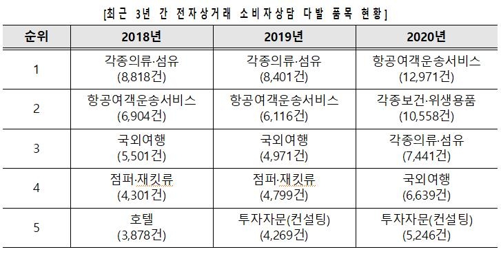| ▲ 2018~2020년 전자상거래 소비자 상담 품목 현황 [한국소비자원 보도자료 캡처. 재판매 및 DB 금지] |