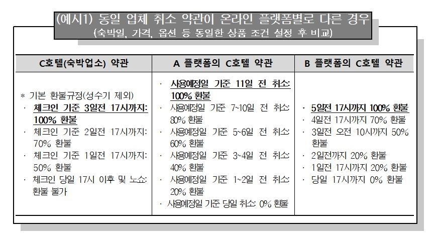 | ▲ 동일 업체 취소 약관이 온라인 플랫폼별로 다른 경우 예시 [한국소비자원 제공, 재판매 및 DB 금지] |