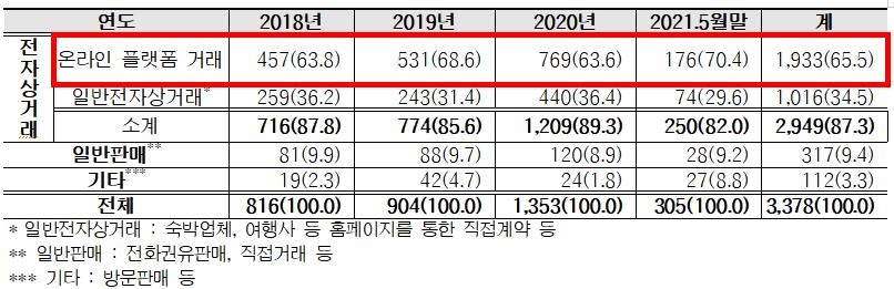 이 중 온라인 숙박 중개업체 같은 온라인 플랫폼 관련 피해구제 신청이 1천933건으로 57.2%를 차지했다.
