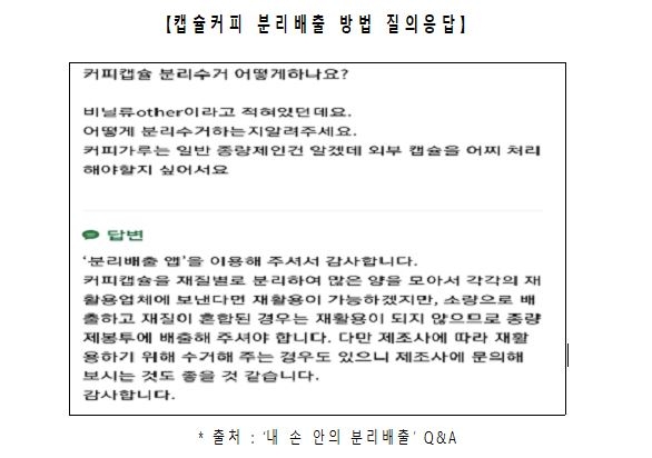 환경부와 한국환경공단 등이 운영하는 '내 손안의 분리배출' 앱은 캡슐용기를 소량 배출하거나 여러 성분이 혼합된 재질일 경우 일반쓰레기로 배출하라고 안내한다.