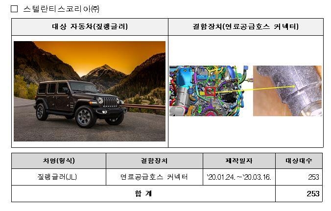 스텔란티스코리아에서 수입·판매한 짚 랭글러 253대는 연료공급 호스를 연결하는 커넥터의 내구성이 약한 것으로 확인됐다. 이로 인한 균열로 연료가 새고 화재가 발생할 가능성이 있어 리콜이 결정됐다.